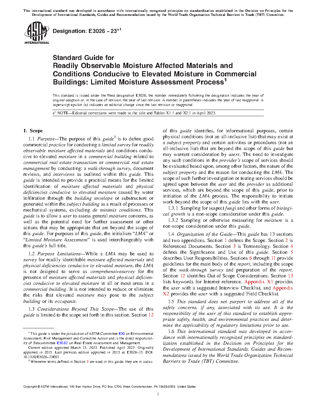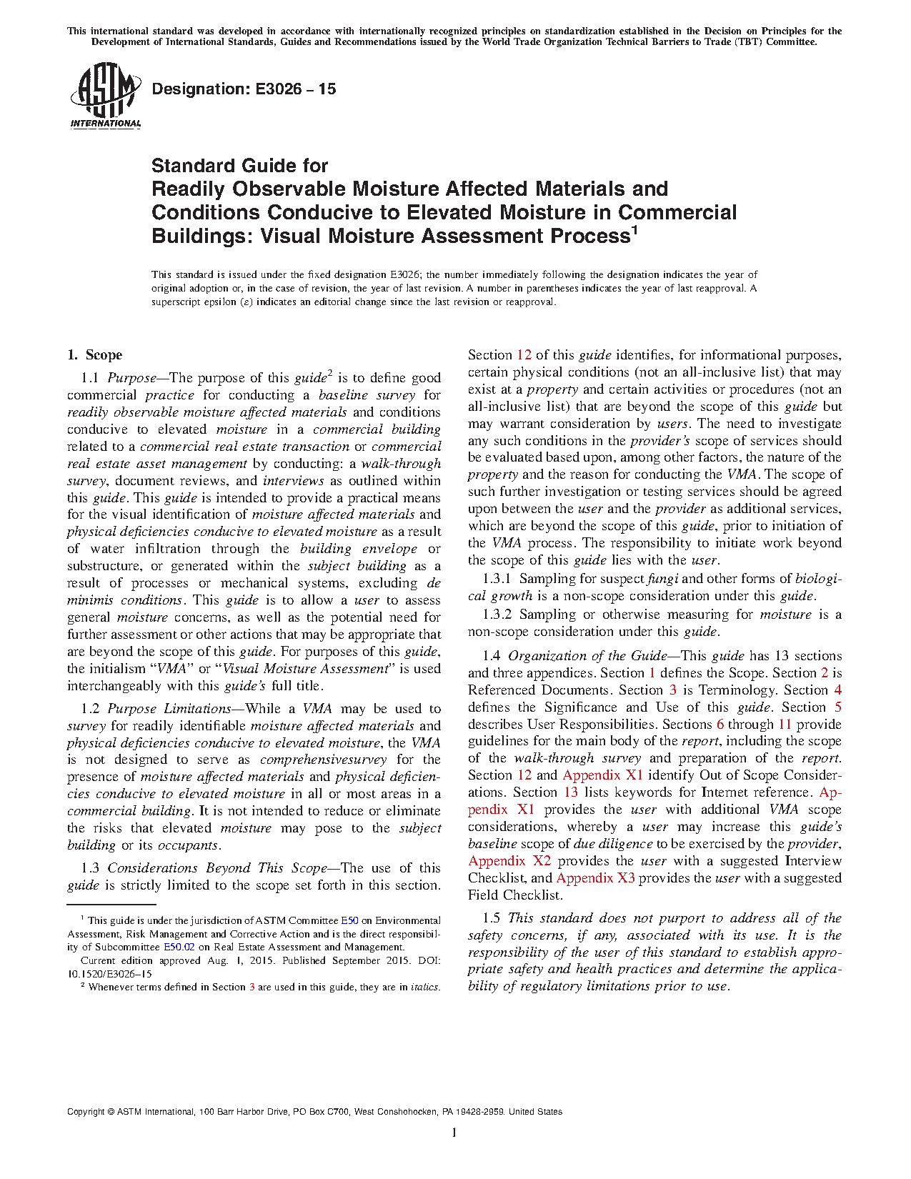 1.1 Purpose—The purpose of this guide2 is to define good commercial practice for conducting a limited survey for readily observable moisture affected materials and conditions conducive to elevated moisture in a commercial building related to commercial real estate transaction or commercial real estate management by conducting: a walk-through survey, document reviews, and interviews as outlined within this guide. This guide is intended to provide a practical means for the limited identification of moisture affected materials and physical deficiencies conducive to elevated moisture caused by water infiltration through the building envelope or substructure or generated within the subject building as a result of processes or mechanical systems, excluding de minimis conditions. This guide is to allow a user to assess general moisture concerns, as well as the potential need for further assessment or other actions that may be appropriate that are beyond the scope of this guide. For purposes of this guide, the initialism “LMA” or “Limited Moisture Assessment” is used interchangeably with this guide’s full title.