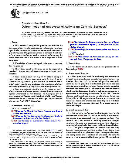 1.1 This practice is designed to quantitatively evaluate the antibacterial activity of glazed ceramic surfaces that have been specifically designed to contain an antibacterial treatment as part of the glaze. This practice is meant to compare the efficacy of one ceramic surface to another ceramic surface using the stated conditions and is not meant to be extrapolated to other conditions.