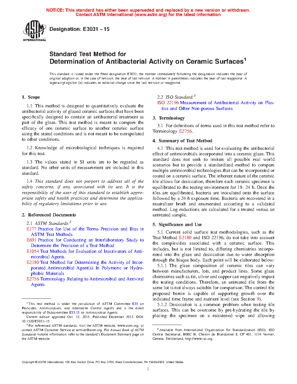 5.1 Current solid surface test methodologies, such as the Test Method E2180 and ISO 22196, do not take into account the complexities associated with a ceramic surface. This includes, but is not limited to, differing chemistries incorporated into the glaze and desiccation due to water absorption through the bisque body. Each point will be elaborated below: