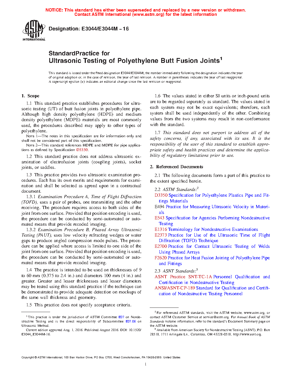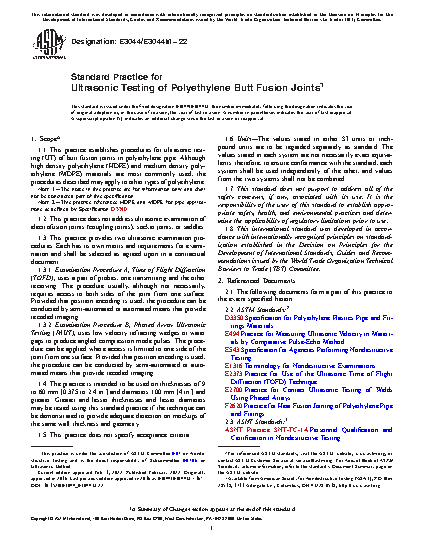 5.3 Two ultrasonic techniques have proven useful to provide examination of fusion joint integrity; Ultrasonic time-of-flight-diffraction (TOFD) and phased array ultrasonic testing (PAUT). These techniques are often considered complementary but may be used independently of each other. The choice of the technique used may depend on a variety of parameters including diameter, thickness, surface access, detection capabilities near surfaces, and quality level required.
