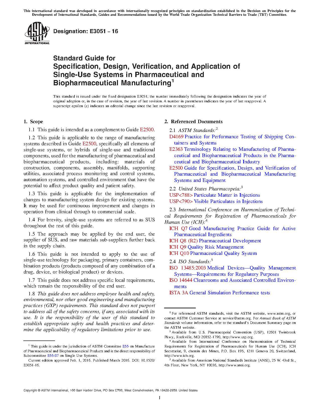 1.2 This guide is applicable to the range of manufacturing systems described in Guide E2500, specifically all elements of single-use systems, or hybrids of single-use and traditional components, used for the manufacturing of pharmaceutical and biopharmaceutical products, including: materials of construction, components, assembly, manifolds, supporting utilities, associated process monitoring and control systems, automation systems, and controlled environment that have the potential to affect product quality and patient safety.
