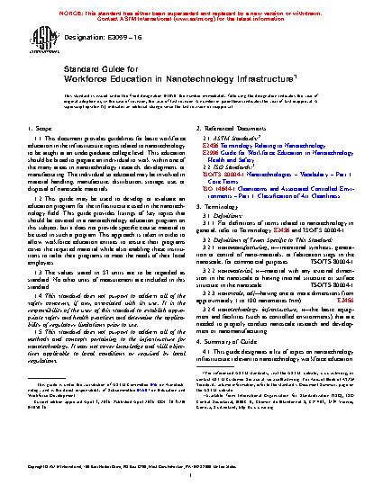 1.2 This guide may be used to develop or evaluate an education program for the infrastructure used in the nanotechnology field. This guide provides listings of key topics that should be covered in a nanotechnology education program on this subject, but it does not provide specific course material to be used in such a program. This approach is taken in order to allow workforce education entities to ensure their programs cover the required material while also enabling these institutions to tailor their programs to meet the needs of their local employers.
