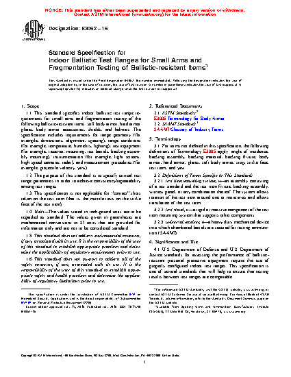 This specification establishes the indoor ballistic test range requirements for small arms and fragmentation testing of the following ballistic-resistant items: soft body armor, hard armor plates, body armor accessories, shields, and helmets. It specifies critical test range parameters in order to achieve consistency/repeatability among test ranges. It does not apply to ‘contact’ shots taken on the test item (that is, the muzzle rests on the strike face of the test item).