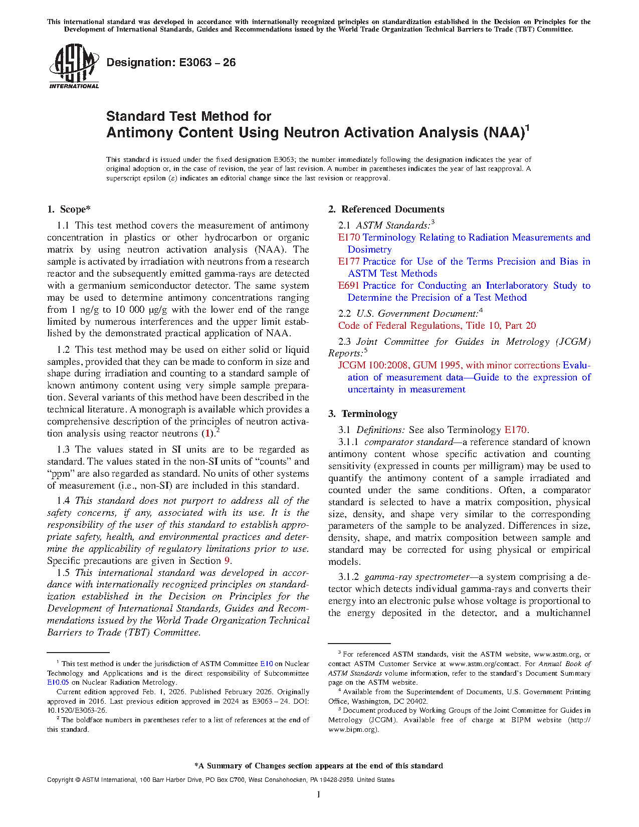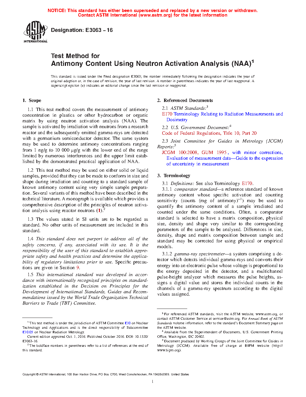 1.1 This test method covers the measurement of antimony concentration in plastics or other hydrocarbon or organic matrix by using neutron activation analysis (NAA). The sample is activated by irradiation with neutrons from a research reactor and the subsequently emitted gamma-rays are detected with a germanium semiconductor detector. The same system may be used to determine antimony concentrations ranging from 1 ng/g to 10 000 μg/g with the lower end of the range limited by numerous interferences and the upper limit established by the demonstrated practical application of NAA.
