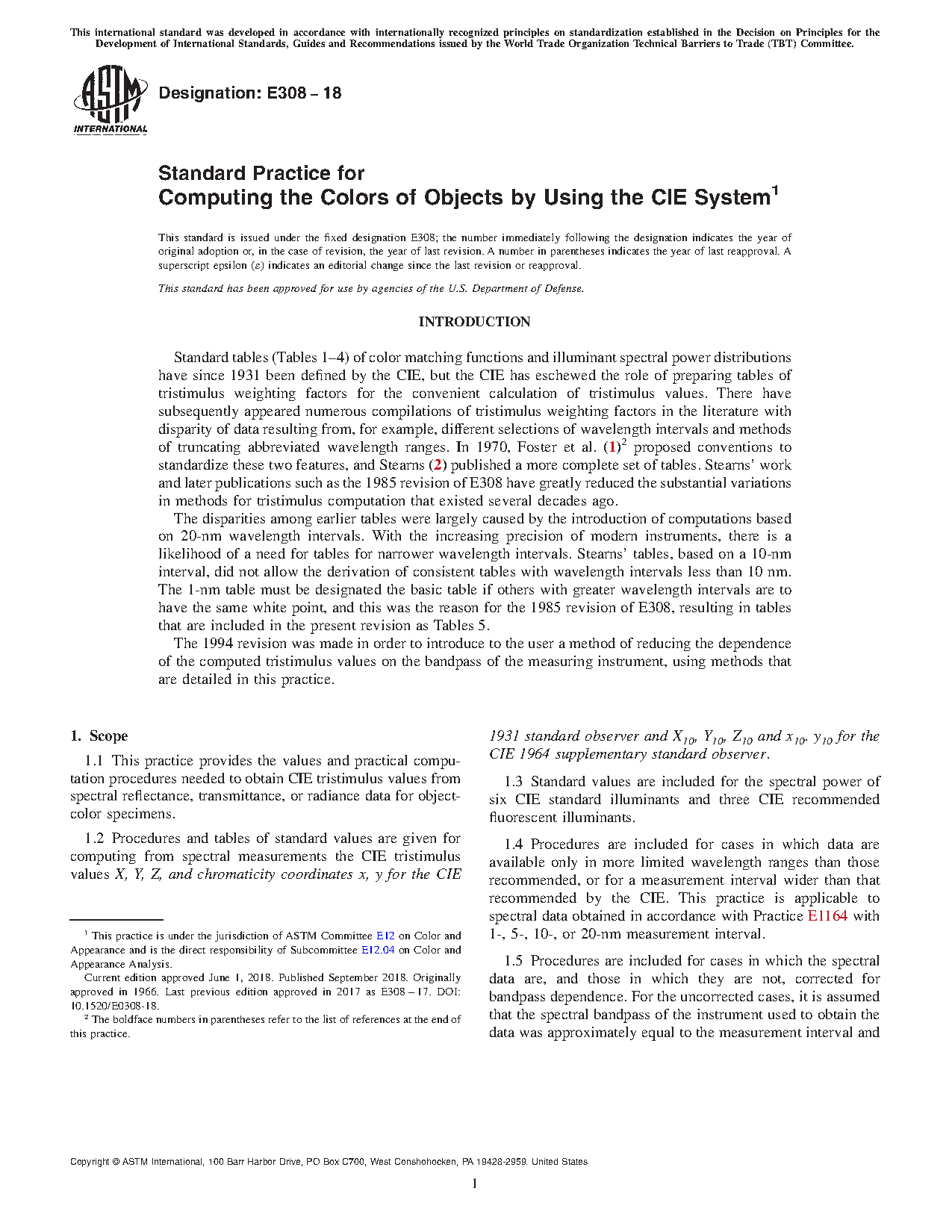 1.2 Procedures and tables of standard values are given for computing from spectral measurements the CIE tristimulus values X, Y, Z, and chromaticity coordinates x, yfor the CIE 1931 standard observer and X