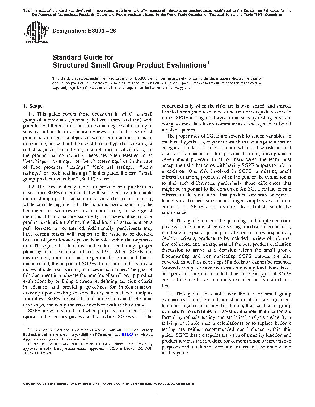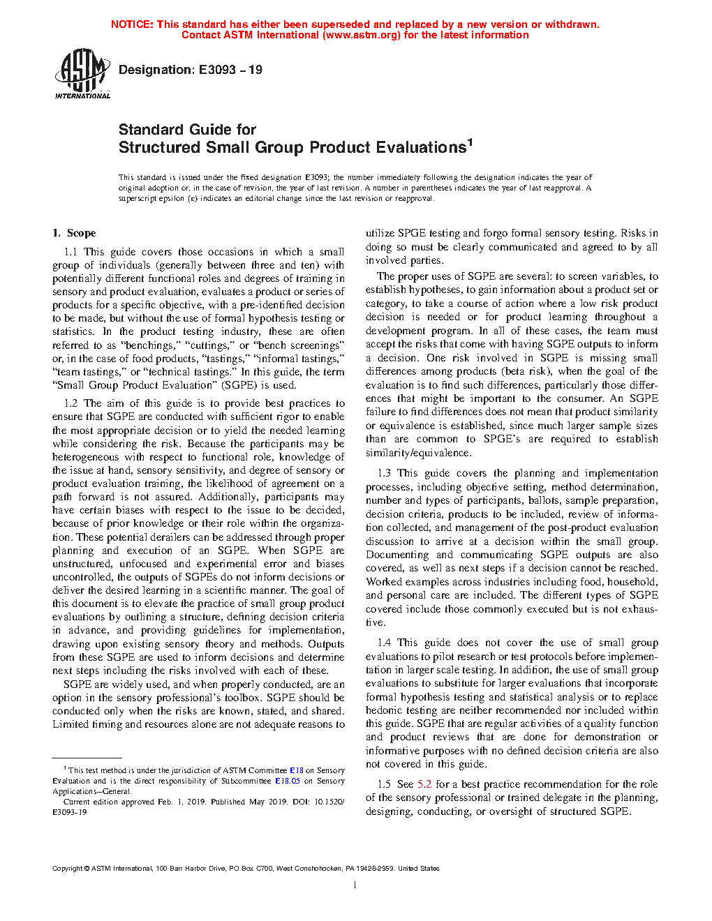 1.1 This guide covers those occasions in which a small group of individuals (generally between three and ten) with potentially different functional roles and degrees of training in sensory and product evaluation, evaluates a product or series of products for a specific objective, with a pre-identified decision to be made, but without the use of formal hypothesis testing or statistics. In the product testing industry, these are often referred to as “benchings,” “cuttings,” or “bench screenings” or, in the case of food products, “tastings,” “informal tastings,” “team tastings,” or “technical tastings.” In this guide, the term “Small Group Product Evaluation” (SGPE) is used.