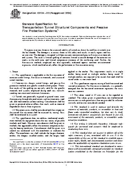 This specification describes an approach for testing the fire resistance of concrete tunnel linings, fire-resistive materials, and structural tunnel members. It requires testing of both horizontal and vertical orientations and is limited to concrete mix design and fire-resistive materials, as well as the potential impact of environmental exposures (optional). A minimum of one fire test is required for each assembly, configuration, and orientation. For cases where the concrete mix design is intended to address the fire load independent of fire-resistive materials, the Spalling Test is applicable. For cases where standard or general concrete design mix is intended and protected by fire-resistive materials, the Fire-Resistive Material Test is applicable. For cases where both the concrete design mix and fire-resistive materials are combined to address the fire load, both test criteria are applicable but can be accomplished with one fire test for each assembly, configuration, and orientation. The test methods covered by this specification are used to determine the performance of tunnel construction elements with respect to exposure to a standard time-temperature fire test. The tests include surface burning test, environmental tests (optional: ground water test, road salt test, tunnel interior surface washing, spalling test, fire-resistive material test), and fire-resistive joint test.