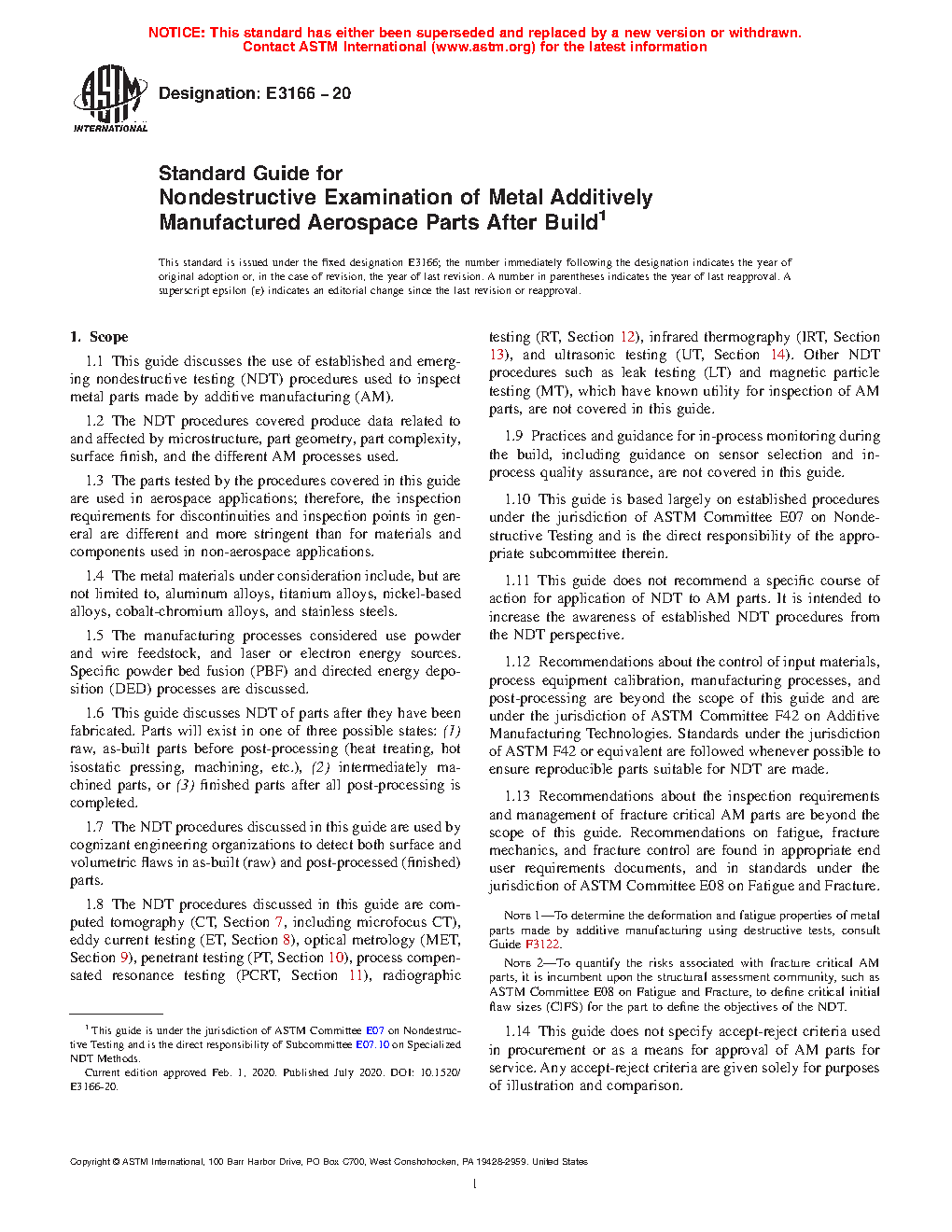 4.2 Established NDT procedures such as those given in ASTM E07 standards are the basis for the NDT procedures discussed in this guide. These NDT procedures are used to inspect production parts before or after post-processing or finishing operations, or after receipt of finished parts by the end user prior to installation. The NDT procedures described in this guide are based on procedures developed for conventionally manufactured cast, wrought, or welded production parts.