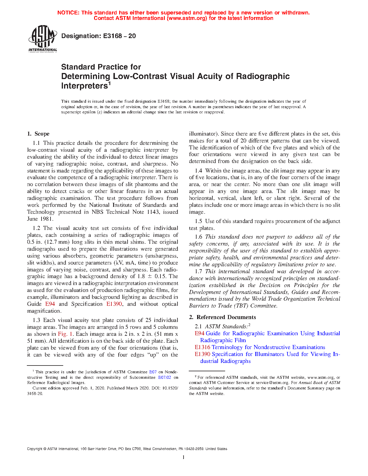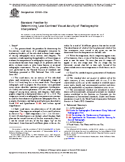 1.1 This practice details the procedure for determining the low-contrast visual acuity of a radiographic interpreter by evaluating the ability of the individual to detect linear images of varying radiographic noise, contrast, and sharpness. No statement is made regarding the applicability of these images to evaluate the competence of a radiographic interpreter. There is no correlation between these images of slit phantoms and the ability to detect cracks or other linear features in an actual radiographic examination. The test procedure follows from work performed by the National Institute of Standards and Technology presented in NBS Technical Note 1143, issued June 1981.