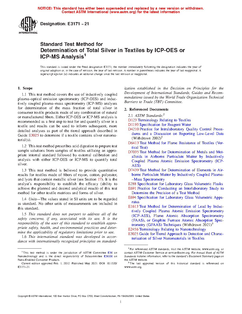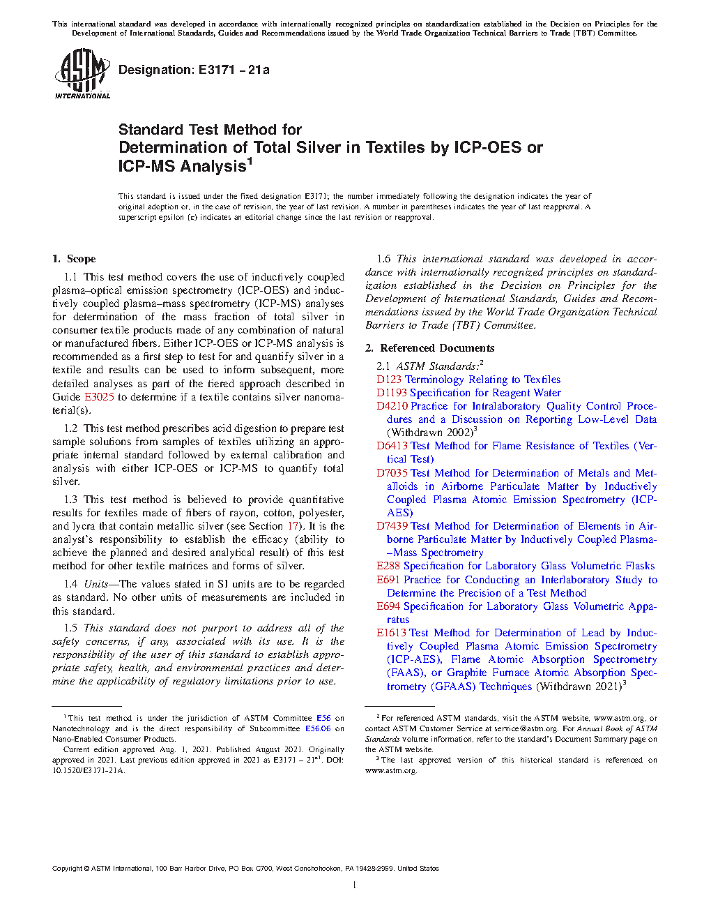 1.2 This test method prescribes acid digestion to prepare test sample solutions from samples of textiles utilizing an appropriate internal standard followed by external calibration and analysis with either ICP-OES or ICP-MS to quantify total silver.