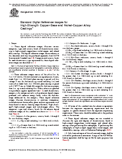 1.1 These digital reference images illustrate various categories, types and severity levels of discontinuities occurring in high-strength copper-base, nickel-copper, and related alloy castings. The digital reference images are an adjunct to this document and must be purchased separately from ASTM International if needed (see 2.4). Categories and severity levels for each discontinuity type represented by these digital reference images are described in 1.2.