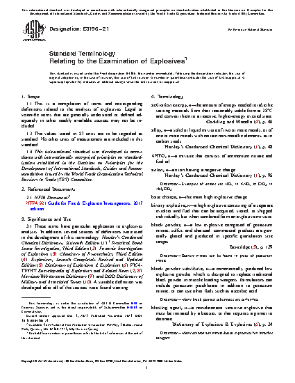 3.1 These terms have particular application to explosives analysis. In addition, several sources of definitions were used in the development of this terminology: Hawley’s Condensed Chemical Dictionary, Sixteenth Edition (1);3 Practical Bomb Scene Investigation, Third Edition (2); Forensic Investigation of Explosions (3); Chemistry of Pyrotechnics, Third Edition (4); Explosives, Seventh Completely Revised and Updated Edition (5); Dictionary of Explosions & Explosives (6); PICATINNY Encyclopedia of Explosives and Related Items (7, 8); Merriam-Webster.com Dictionary (9); and DOD Dictionary of Military and Associated Terms (10). A suitable definition was developed after all of the sources were found wanting.