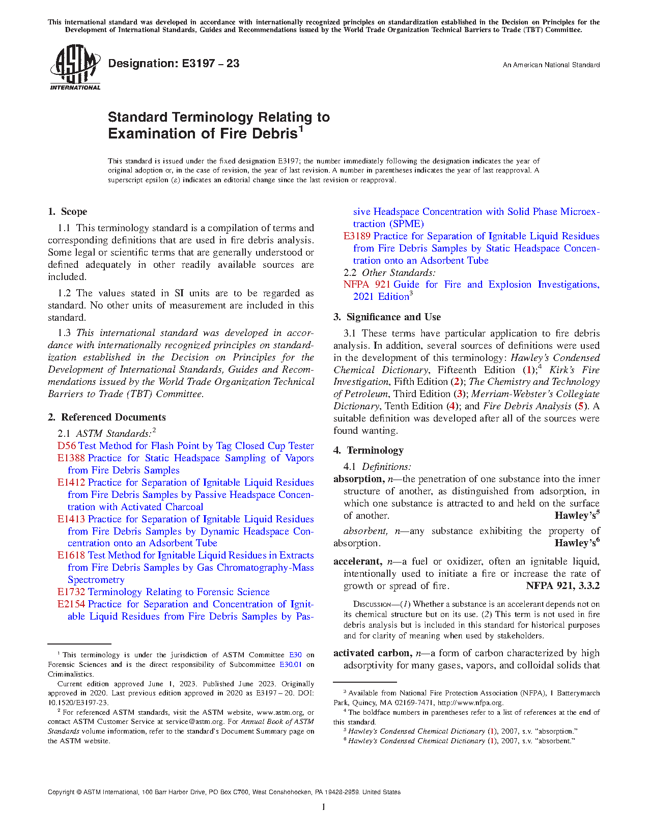 1.1 This terminology standard is a compilation of terms and corresponding definitions that are used in fire debris analysis. Some legal or scientific terms that are generally understood or defined adequately in other readily available sources are included.