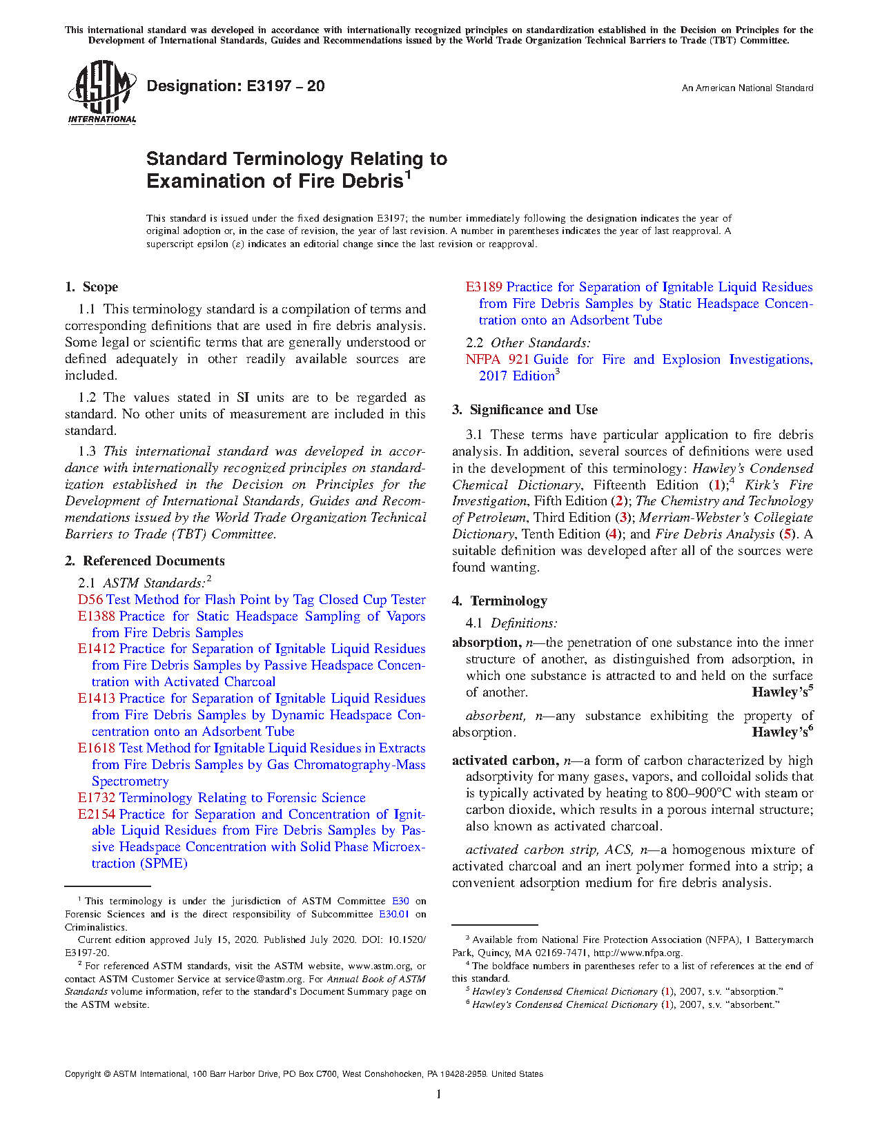 3.1 These terms have particular application to fire debris analysis. In addition, several sources of definitions were used in the development of this terminology: Hawley’s Condensed Chemical Dictionary, Fifteenth Edition (1);4 Kirk’s Fire Investigation, Fifth Edition (2); The Chemistry and Technology of Petroleum, Third Edition (3); Merriam-Webster’s Collegiate Dictionary, Tenth Edition (4); and Fire Debris Analysis (5). A suitable definition was developed after all of the sources were found wanting.