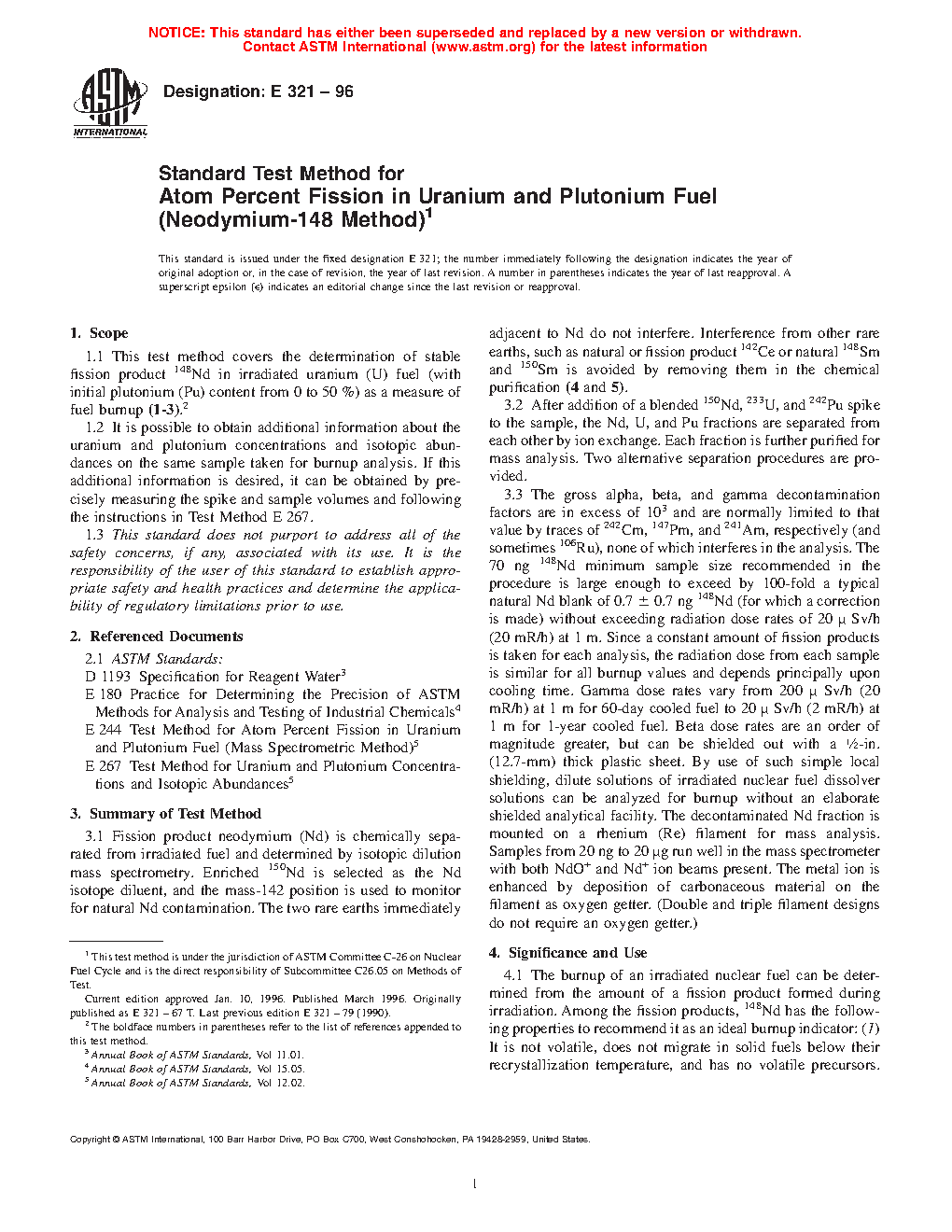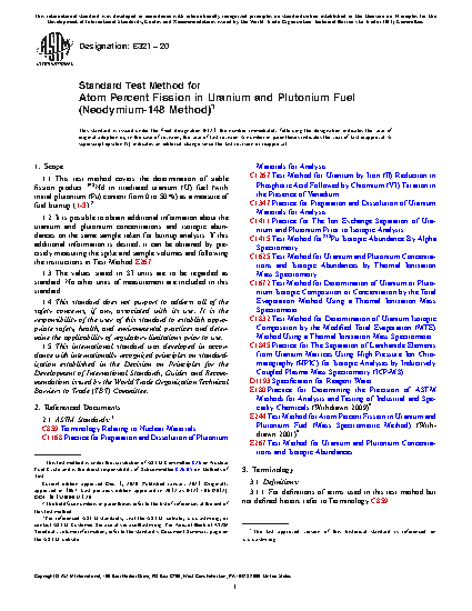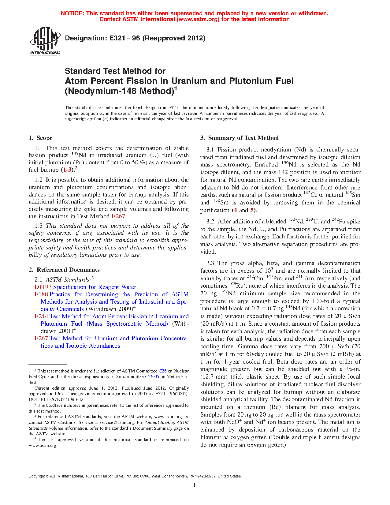 1.1 This test method covers the determination of stable fission product 148Nd in irradiated uranium (U) fuel (with initial plutonium (Pu) content from 0 to 50 %) as a measure of fuel burnup (1-3).2