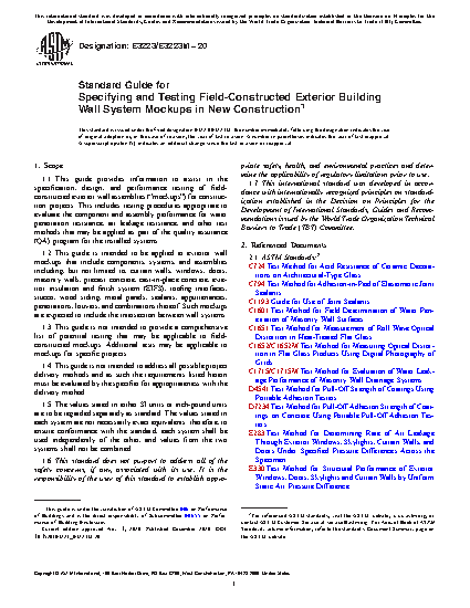 1.1 This guide provides information to assist in the specification, design, and performance testing of field-constructed exterior wall assemblies (“mockups”) for construction projects. This includes testing procedures appropriate to evaluate the component and assembly performance for water penetration resistance, air leakage resistance, and other test methods that may be applied as part of the quality assurance (QA) program for the installed systems.