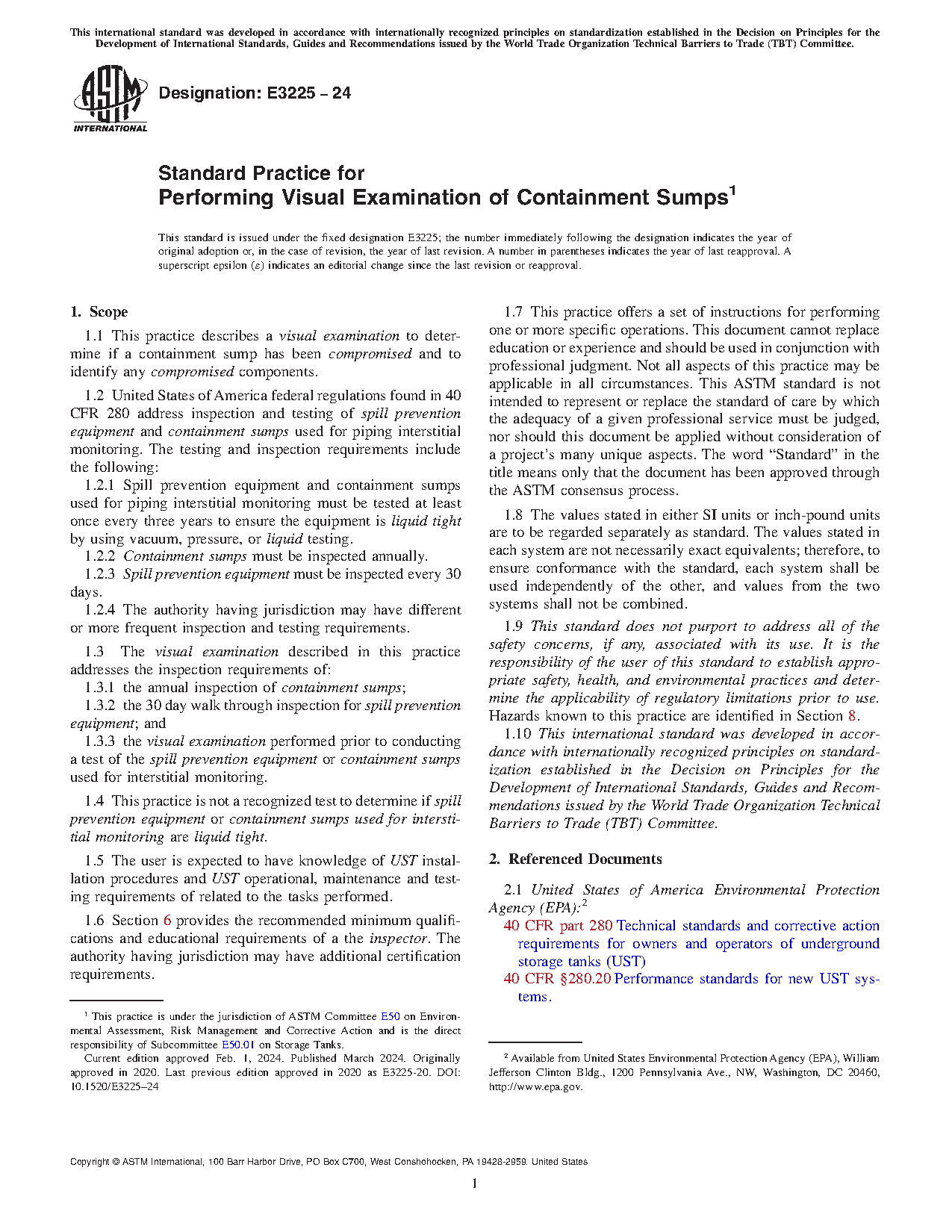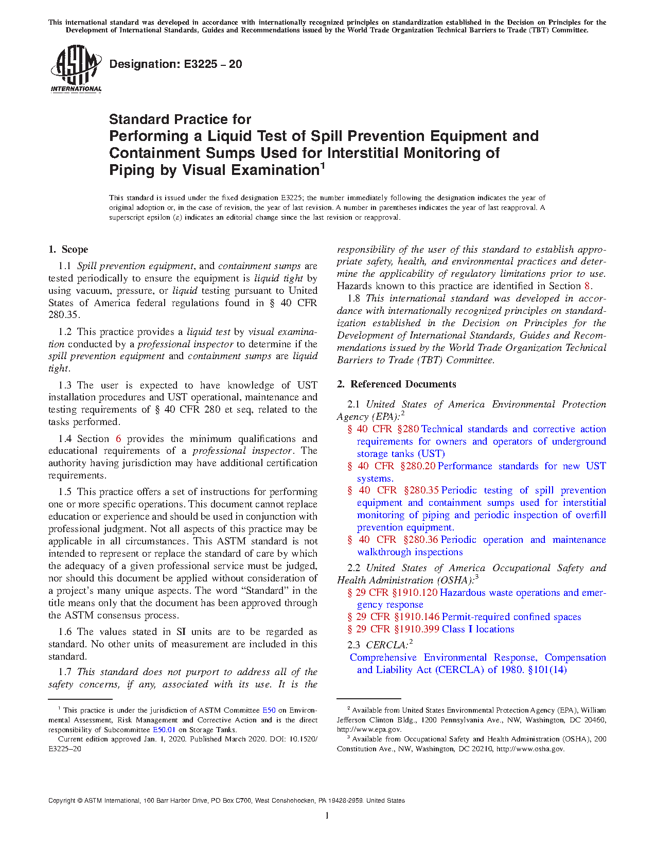1.2 This practice provides a liquid test by visual examination conducted by a professional inspector to determine if the spill prevention equipment and containment sumps are liquid tight.