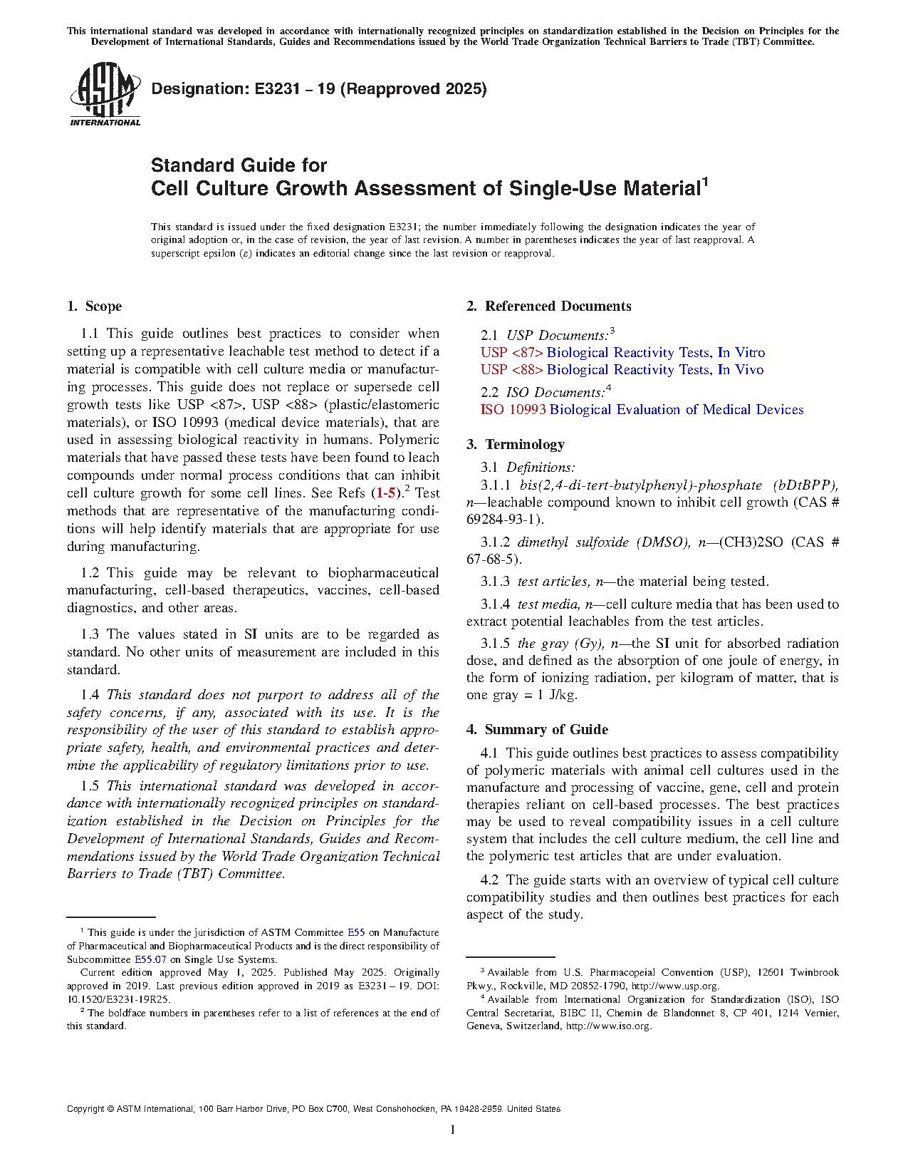 1.1 This guide outlines best practices to consider when setting up a representative leachable test method to detect if a material is compatible with cell culture media or manufacturing processes. This guide does not replace or supersede cell growth tests like USP <87>, USP <88> (plastic/elastomeric materials), or ISO 10993 (medical device materials), that are used in assessing biological reactivity in humans. Polymeric materials that have passed these tests have been found to leach compounds under normal process conditions that can inhibit cell culture growth for some cell lines. See Refs (1-5).2 Test methods that are representative of the manufacturing conditions will help identify materials that are appropriate for use during manufacturing.