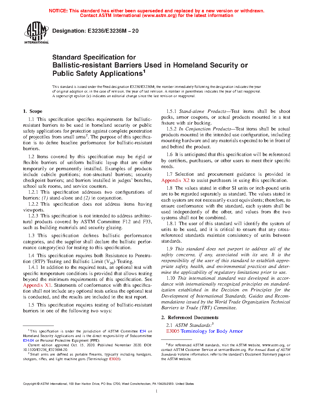 1.1 This specification specifies requirements for ballistic-resistant barriers to be used in homeland security or public safety applications for protection against complete penetration of projectiles from small arms2. The purpose of this specification is to define baseline performance for ballistic-resistant barriers.
