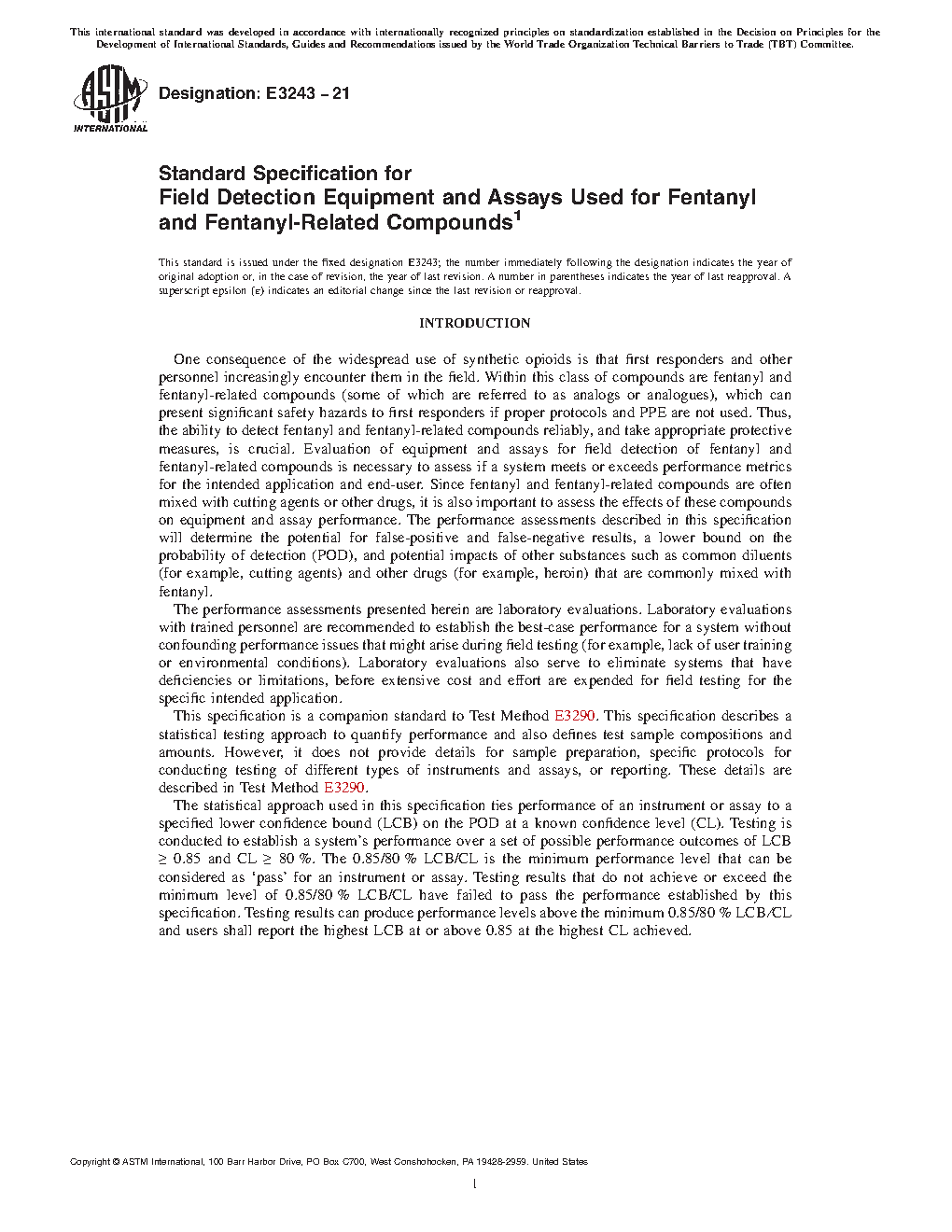 1.1.2 This specification describes required test sample compositions, amounts, and a statistically-based testing approach to be used for evaluating the performance of field fentanyl and fentanyl-related detection equipment and assays as described in Test Method E3290. This specification does not address the estimation of limit of detection.