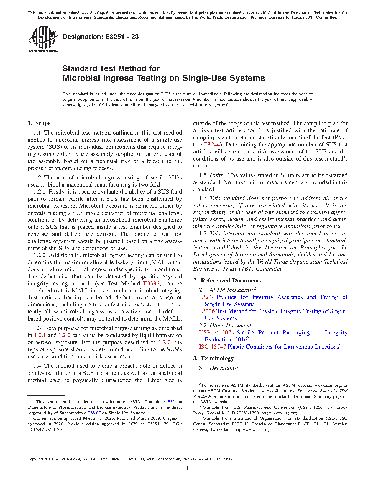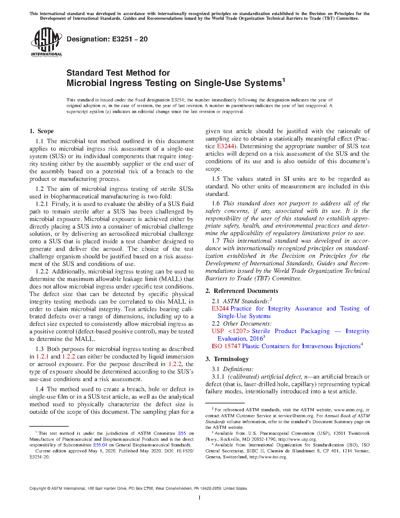 1.1 The microbial test method outlined in this test method applies to microbial ingress risk assessment of a single-use system (SUS) or its individual components that require integrity testing either by the assembly supplier or the end user of the assembly based on a potential risk of a breach to the product or manufacturing process.