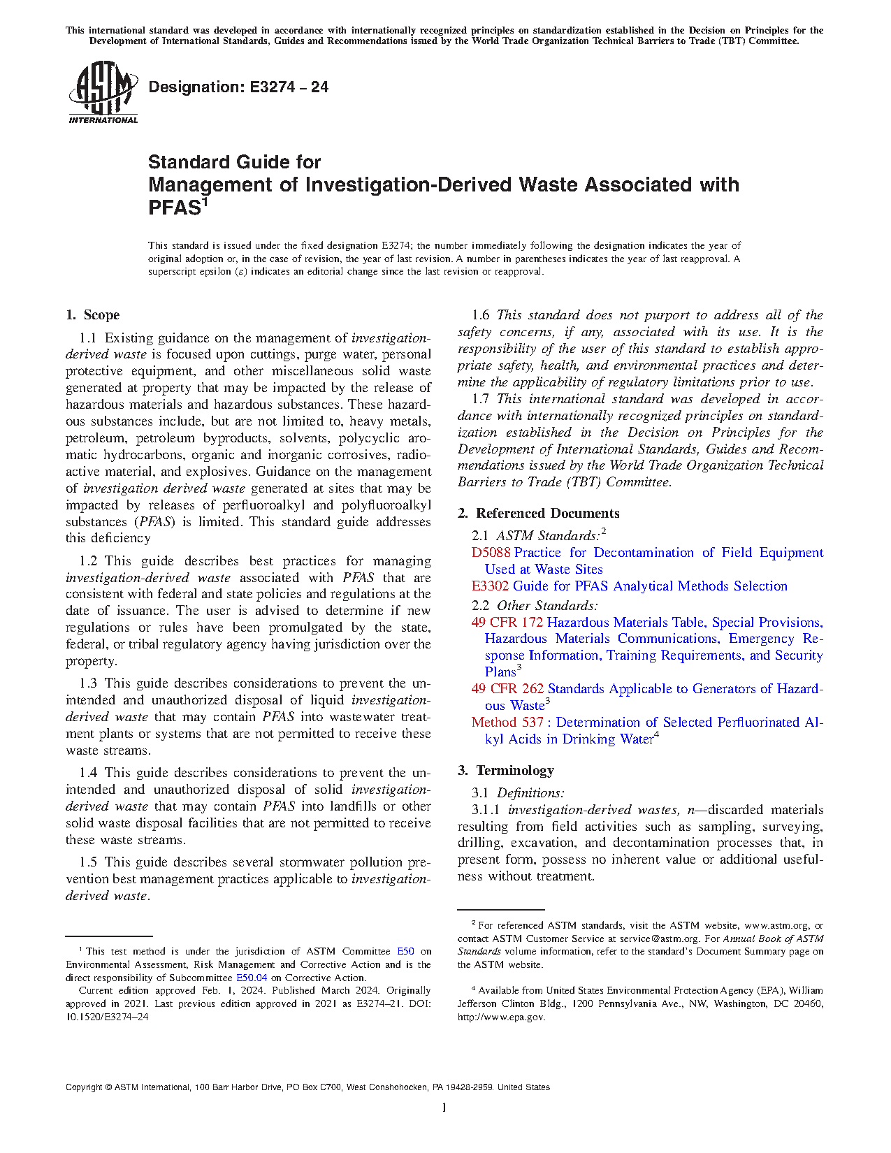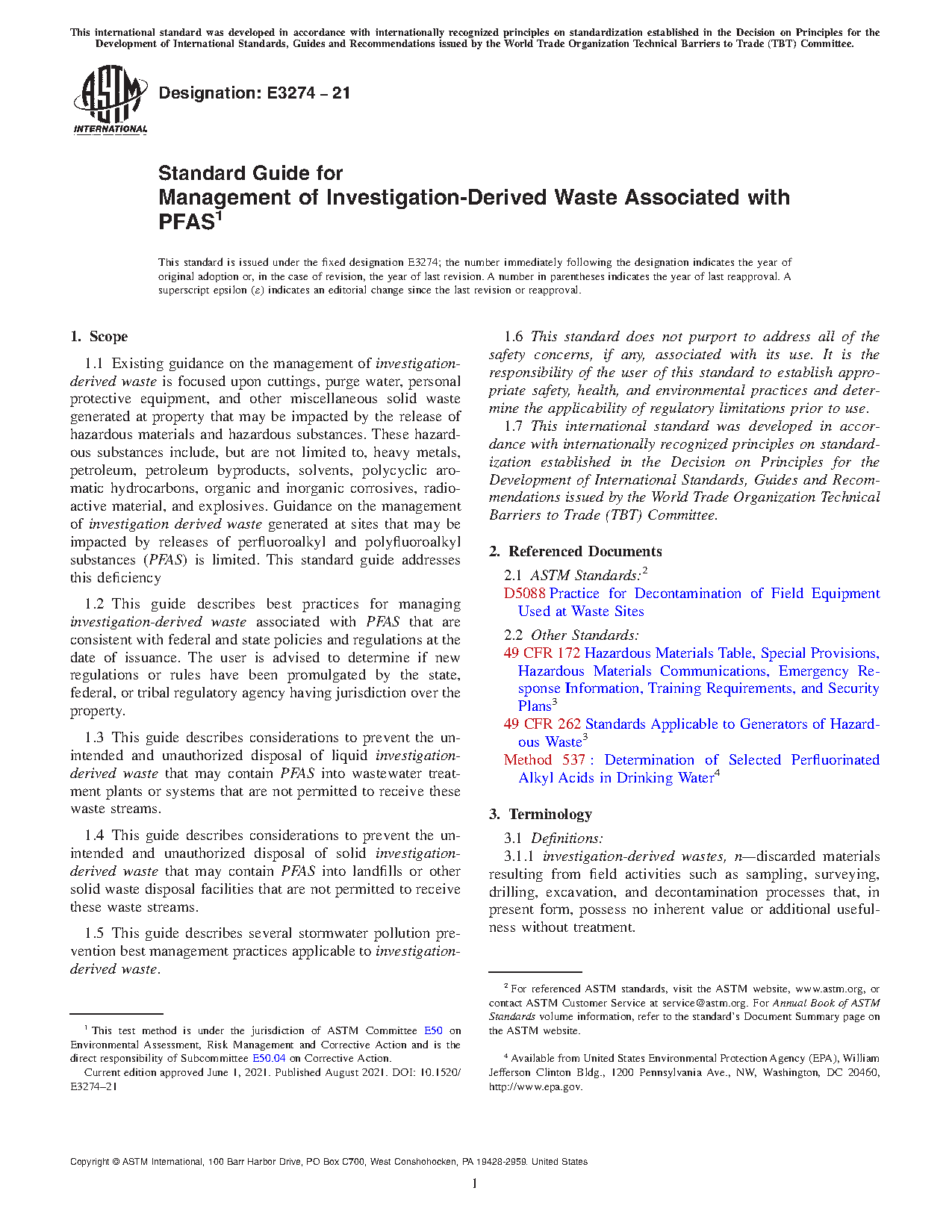 1.2 This guide describes best practices for managing investigation-derived waste associated with PFAS that are consistent with federal and state policies and regulations at the date of issuance. The user is advised to determine if new regulations or rules have been promulgated by the state, federal, or tribal regulatory agency having jurisdiction over the property.