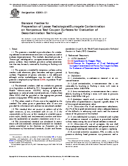 1.1 This practice is intended to provide a basis for simulating radioactive contamination consistent with processes used to evaluate decontamination. The methods described provide a “loose-type” radiological or surrogate contamination on nonporous surfaces; these methods provide a surface contamination that may be easily removed by brushing or flushing with water.