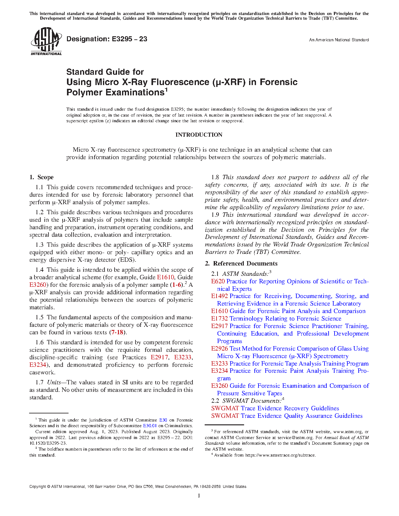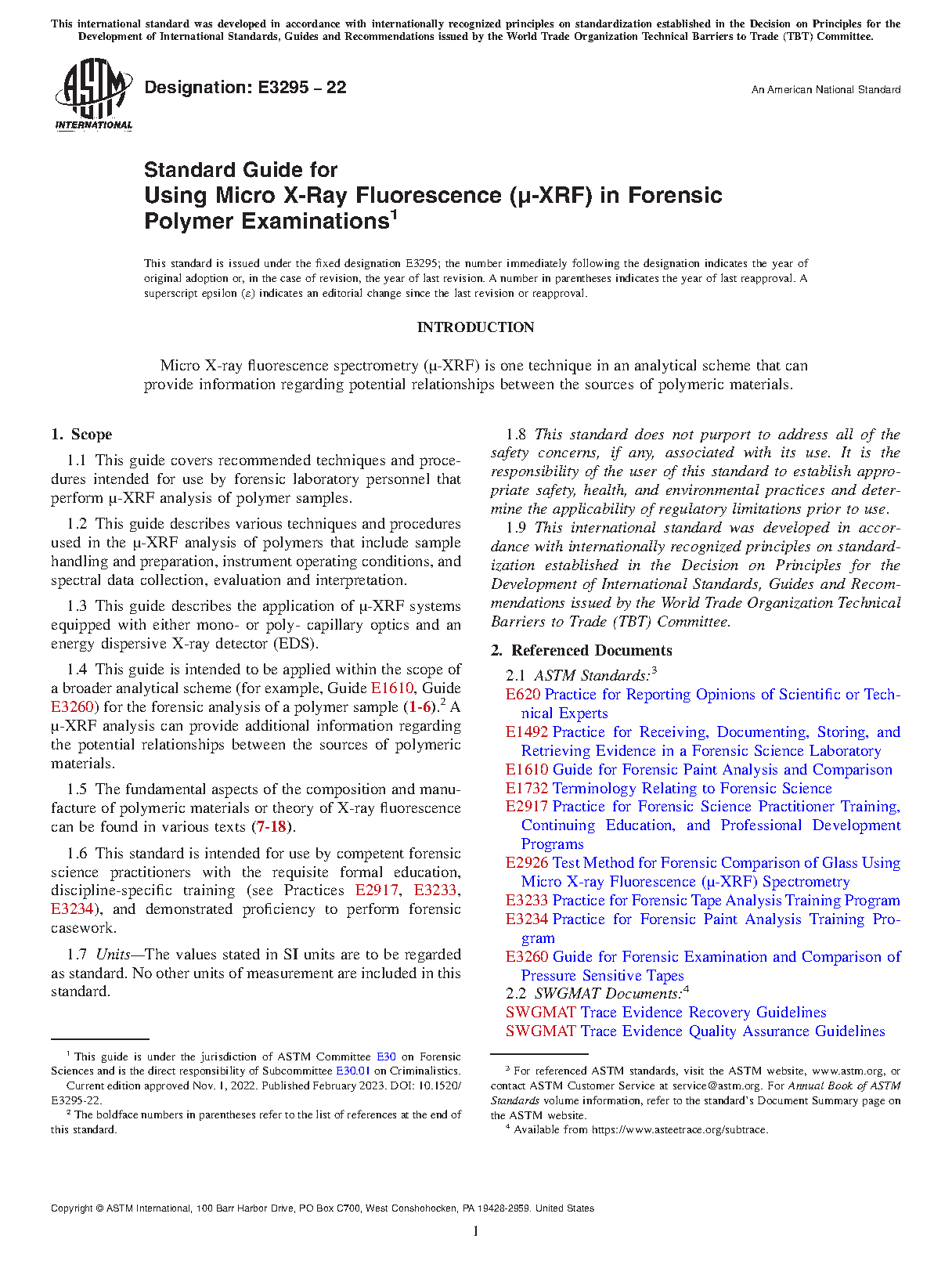 1.4 This guide is intended to be applied within the scope of a broader analytical scheme (for example, Guide E1610, Guide E3260) for the forensic analysis of a polymer sample (1-6).2 A µ-XRF analysis can provide additional information regarding the potential relationships between the sources of polymeric materials.