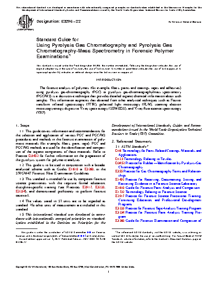 1.1 This guide covers information and recommendations for the selection and application of various PGC and PGC/MS procedures and methods in the forensic examination of polymeric materials (for example, fibers, paint, tape). PGC and PGC/MS methods are used for the identification and comparison of the organic components of these materials. Refer to Practice D3452 for further information on the preparation of the pyrolysis system for polymeric analyses.