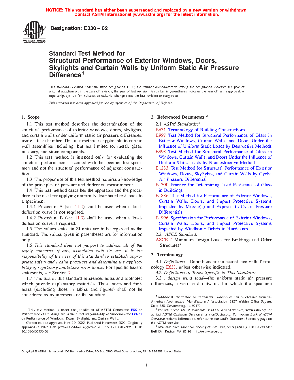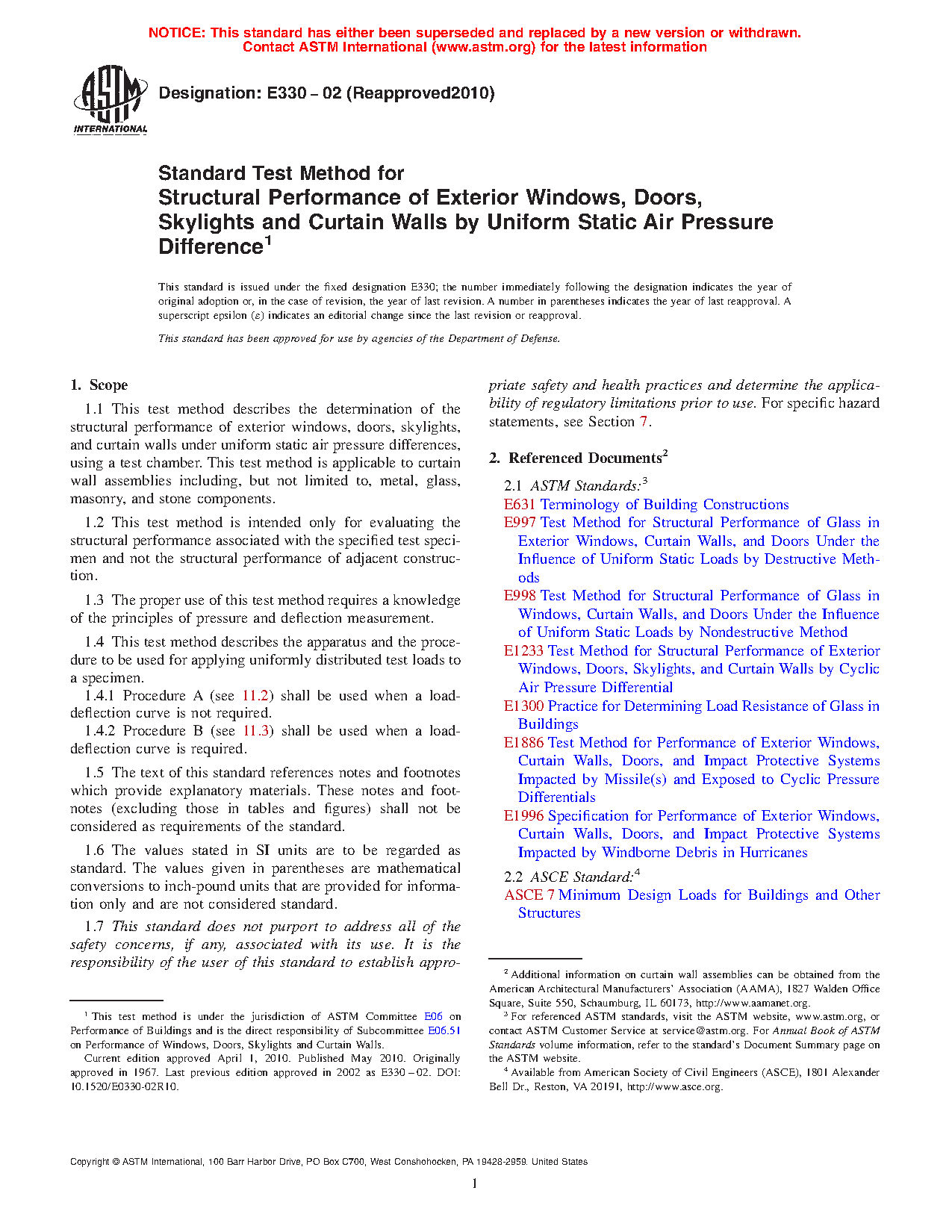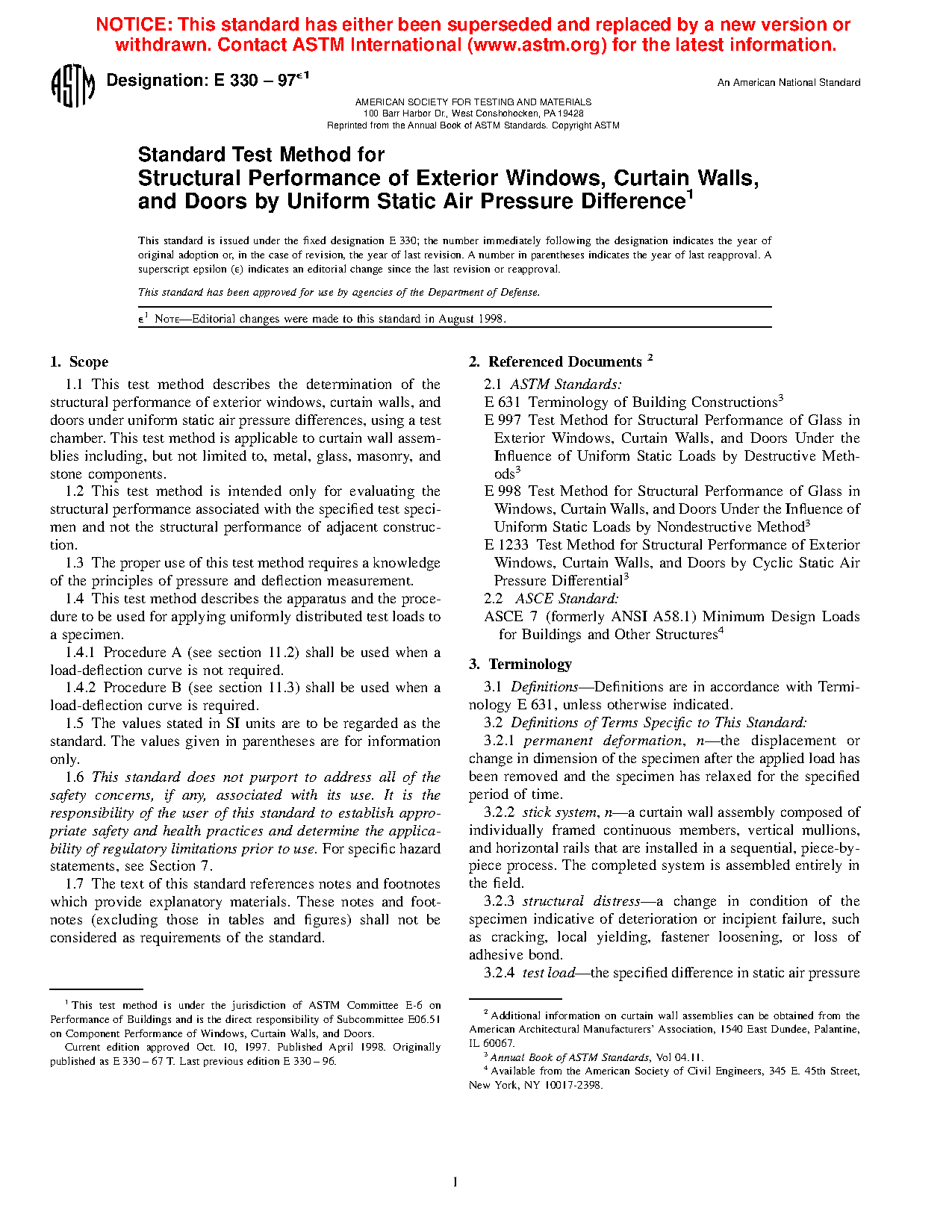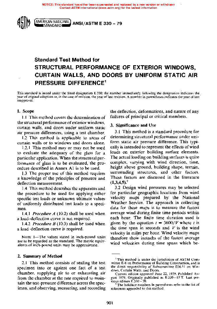 Standard Test Method for Structural Performance of Exterior Windows, Curtain Walls, and Doors by Uniform Static Air Pressure Difference