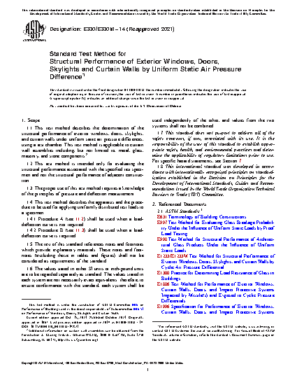 1.1 This test method describes the determination of the structural performance of exterior windows, doors, skylights, and curtain walls under uniform static air pressure differences, using a test chamber. This test method is applicable to curtain wall assemblies including, but not limited to, metal, glass, masonry, and stone components.2
