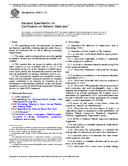 1.1 This specification covers the requirements for material certifications, specifically including materials under the jurisdiction of Committee E29, as well as defining terminology related thereto.
