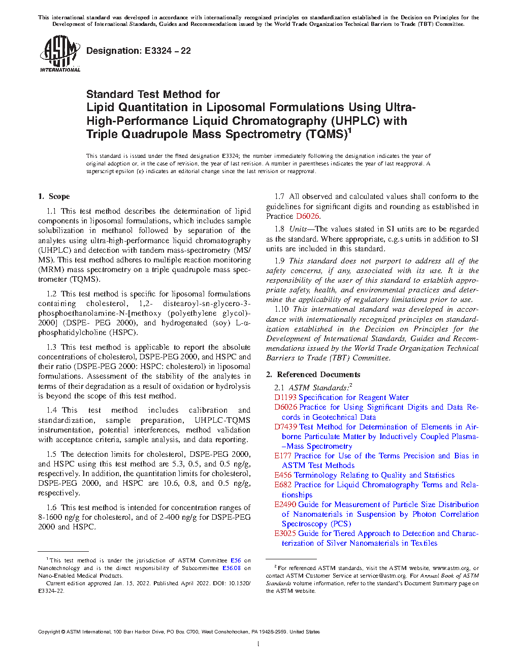 1.2 This test method is specific for liposomal formulations containing cholesterol, 1,2- distearoyl-sn-glycero-3-phosphoethanolamine-N-[methoxy (polyethylene glycol)-2000] (DSPE- PEG 2000), and hydrogenated (soy) L-a-phosphatidylcholine (HSPC).