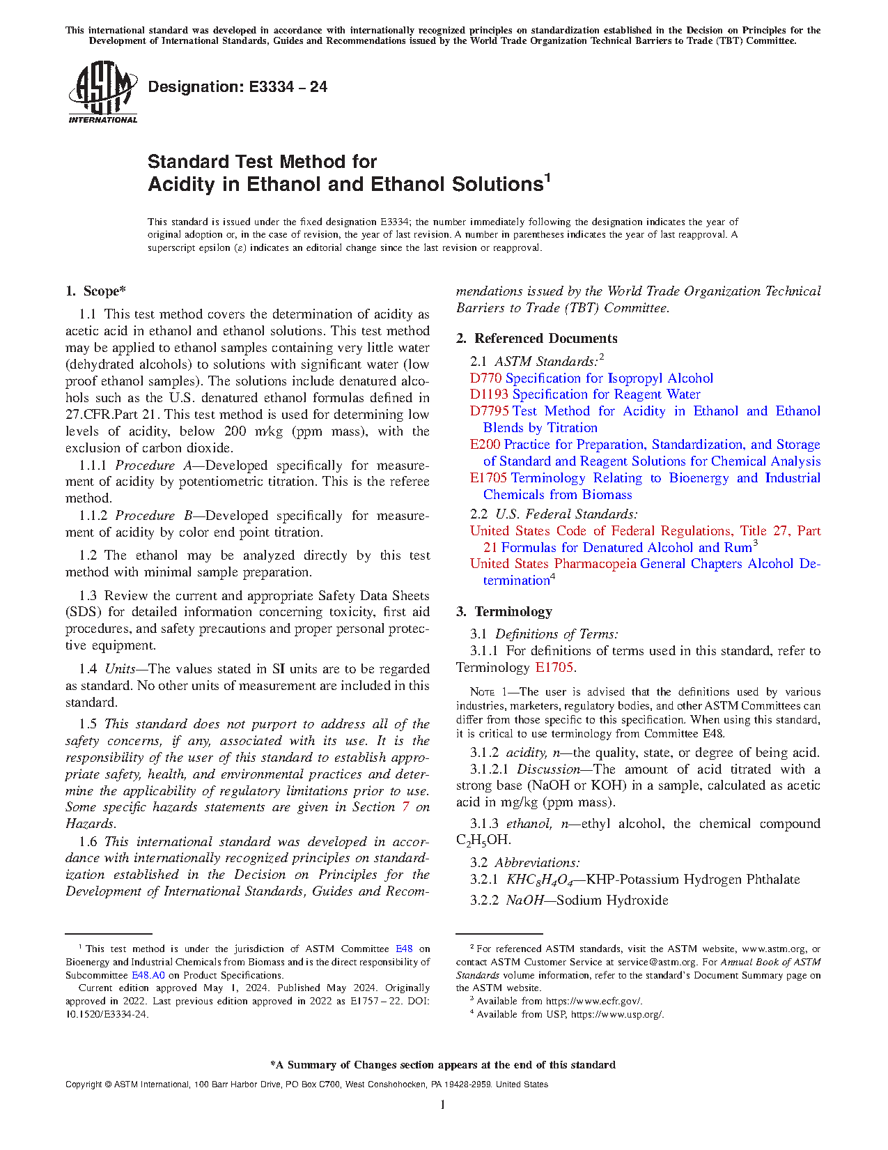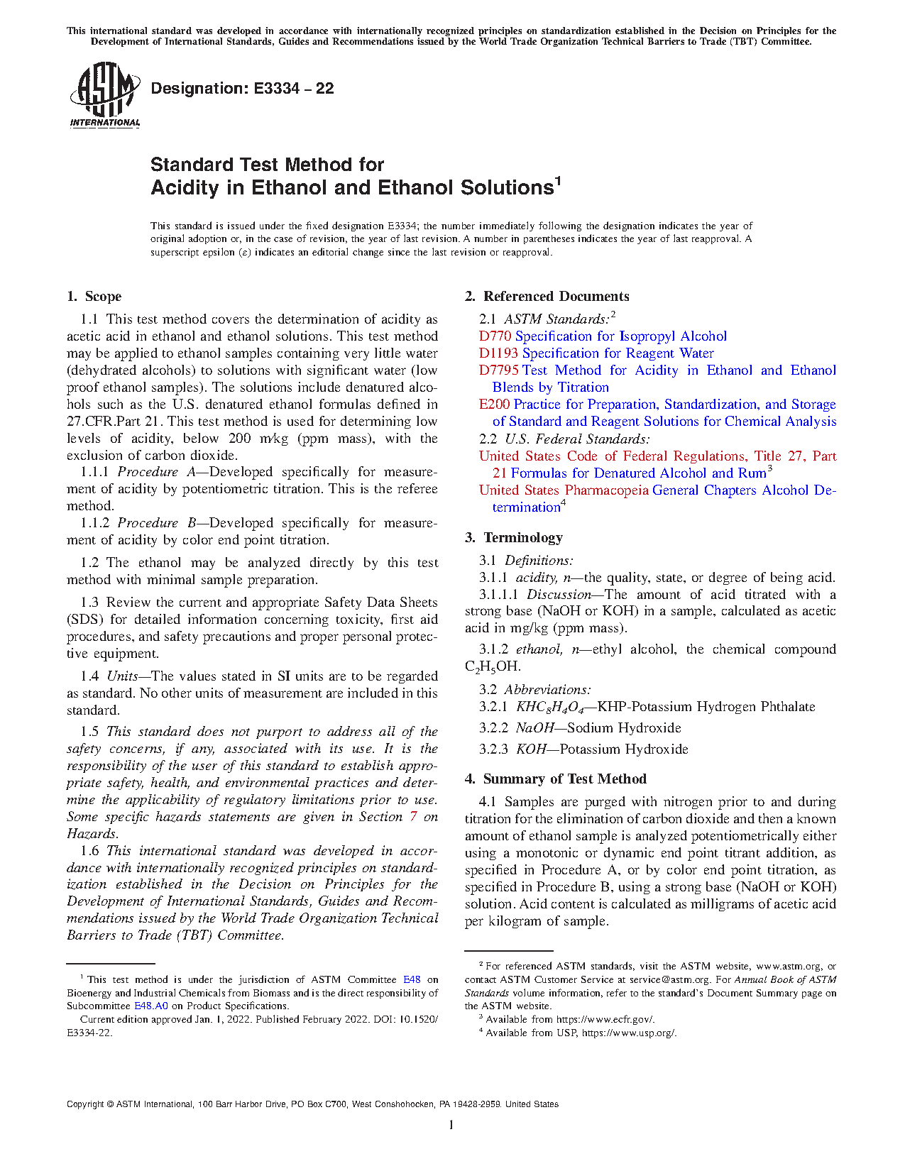 1.1 This test method covers the determination of acidity as acetic acid in ethanol and ethanol solutions. This test method may be applied to ethanol samples containing very little water (dehydrated alcohols) to solutions with significant water (low proof ethanol samples). The solutions include denatured alcohols such as the U.S. denatured ethanol formulas defined in 27.CFR.Part 21. This test method is used for determining low levels of acidity, below 200 m/kg (ppm mass), with the exclusion of carbon dioxide.