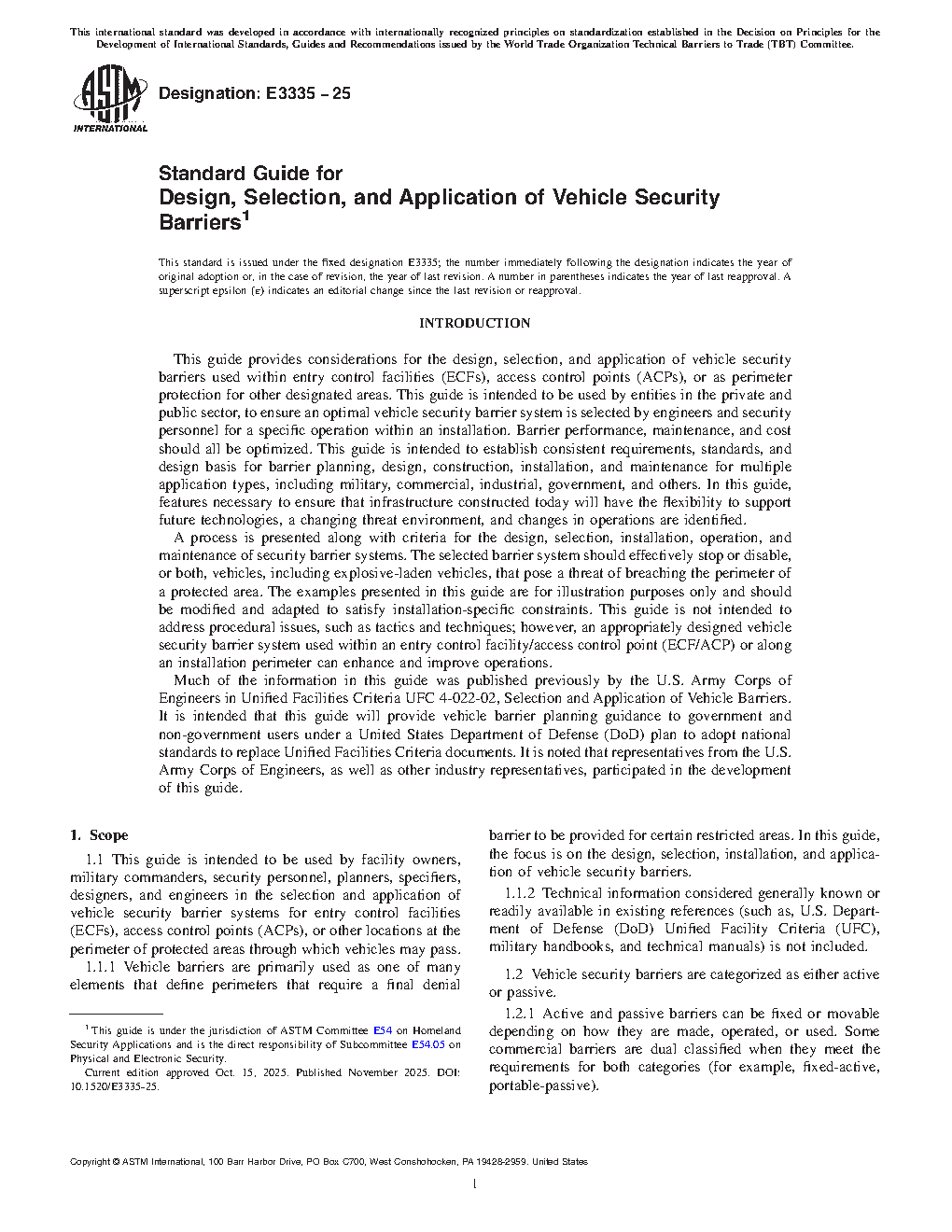 1.1 This guide is intended to be used by facility owners, military commanders, security personnel, planners, specifiers, designers, and engineers in the selection and application of vehicle security barrier systems for entry control facilities (ECFs), access control points (ACPs), or other locations at the perimeter of protected areas through which vehicles may pass.