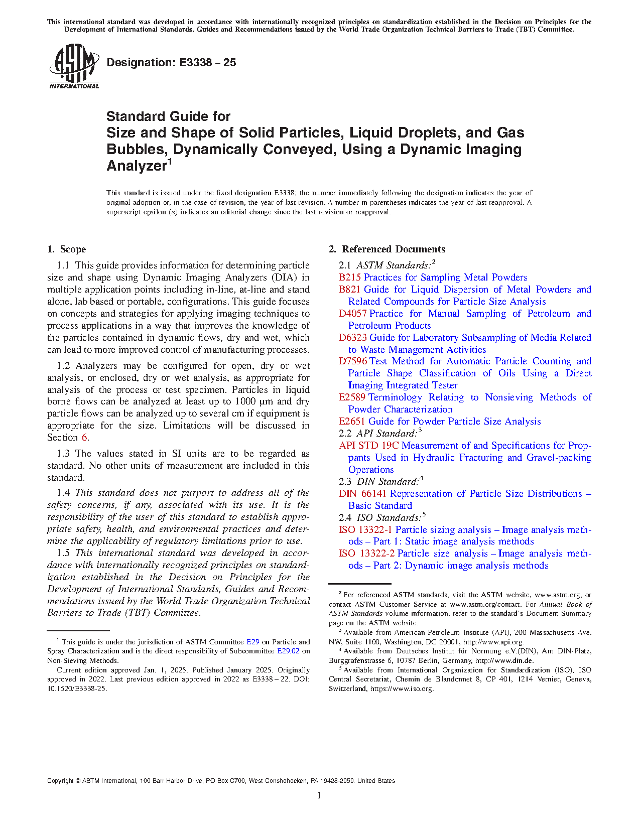 1.1 This guide provides information for determining particle size and shape using Dynamic Imaging Analyzers (DIA) in multiple application points including in-line, at-line and stand alone, lab based or portable, configurations. This guide focuses on concepts and strategies for applying imaging techniques to process applications in a way that improves the knowledge of the particles contained in dynamic flows, dry and wet, which can lead to more improved control of manufacturing processes.