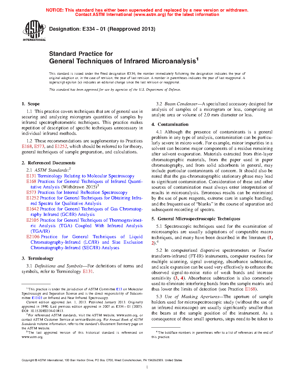 This practice establishes the standard techniques that are of general use in securing and analyzing samples in microgram quantities (microanalysis) by infrared spectrophotometry. These techniques include general microspectroscopy, analysis of gas chromatographic fractions, analysis of liquid chromatographic fractions, analysis of thin-layer chromatographic fractions, analysis of paper chromatographic fractions, analysis of gases evolved from a thermogravimetric analyzer, and infrared spectroscopy using a microscope.