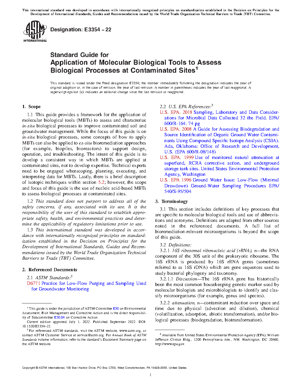 1.1 This guide provides a framework for the application of molecular biological tools (MBTs) to assess and characterize in-situ biological processes to improve contaminated soil and groundwater management. While the focus of this guide is on in-situ biological processes, some concepts of how to apply MBTs can also be applied to ex-situ bioremediation approaches (for example, biopiles, bioreactors) to support design, operation, and troubleshooting. The intent of this guide is to develop a consistent way in which MBTs are applied at contaminated sites, not to develop expertise. Technical experts need to be engaged whenscoping, planning, executing, and interpreting data for MBTs. Lastly, there is a brief description of isotopic techniques within section 5.2; however, the scope and focus of this guide is the use of nucleic acid-based MBTs to assess biological processes at contaminated sites.