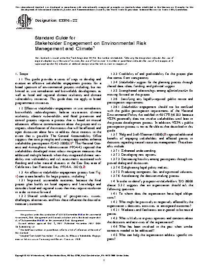 1.1 This guide provides a series of steps to develop and execute an effective stakeholder engagement process for a broad spectrum of environmental projects including, but not limited to, site remediation and brownfields development, as well as local and regional climate resiliency and climate vulnerability initiatives. This guide does not apply to broad programmatic initiatives.