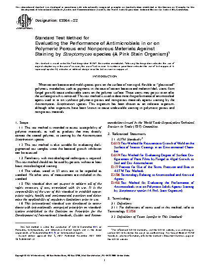 5.1 Methods such as D3273 Standard Test Method for Resistance to Growth of Mold on the Surface of Interior Coatings in an Environmental Chamber and D3274 Standard Test Method for Evaluating the Degree of Surface Disfigurement of Paint Films by Fungal or Algal Growth or Soil or Dirt Accumulation provide means for assessing mold and algal staining on paints. The Test Method E1428 Evaluating the Performance of Antimicrobials in or on Polymeric Solids Against Staining by Streptomyces species (A Pink Stain Organism) is used for solid polymeric materials, but is not appropriate for all antimicrobial technologies.