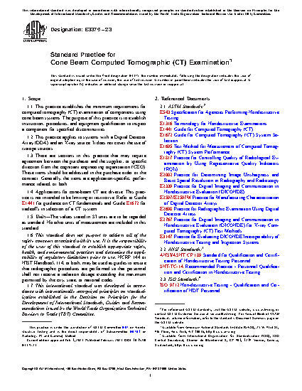 1.1 This practice establishes the minimum requirements for computed tomography (CT) examination of components using cone beam systems. The purpose of this practice is to establish instruction, procedures, and equipment qualification to inspect a component for specified discontinuities.