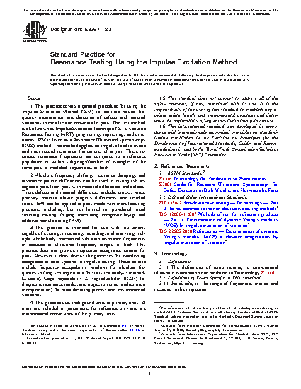 1.1 This practice covers a general procedure for using the Impulse Excitation Method (IEM) to facilitate natural frequency measurement and detection of defects and material variations in metallic and non-metallic parts. This test method is also known as Impulse Excitation Technique (IET), Acoustic Resonance Testing (ART), ping testing, tap testing, and other names. IEM is listed as a Resonance Ultrasound Spectroscopy (RUS) method. The method applies an impulse load to excite and then record resonance frequencies of a part. These recorded resonance frequencies are compared to a reference population or within subgroups/families of examples of the same part, or modeled frequencies, or both.