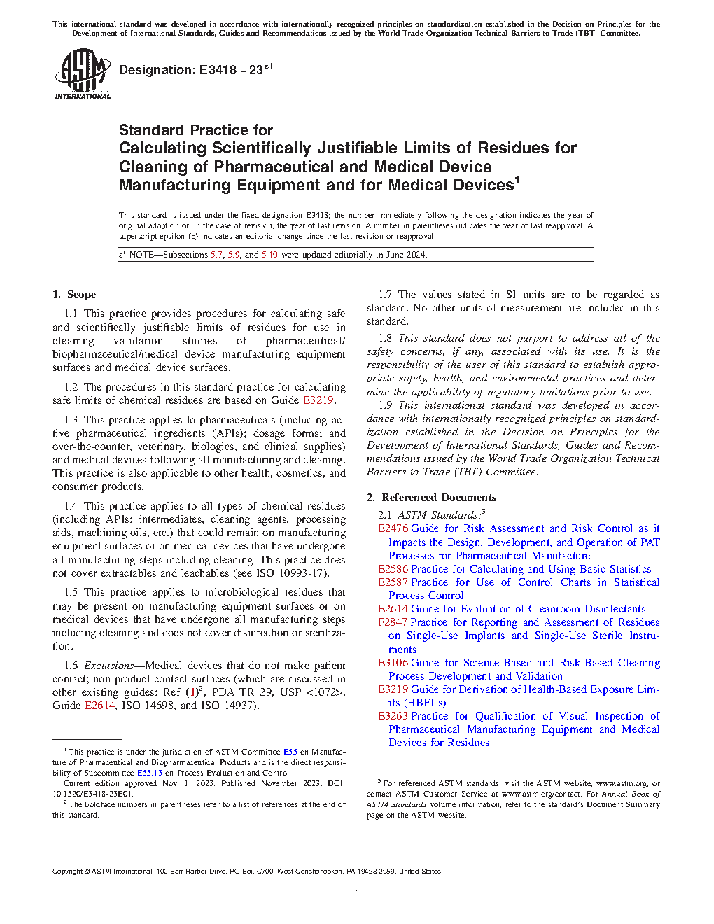 1.1 This practice provides procedures for calculating safe and scientifically justifiable limits of residues for use in cleaning validation studies of pharmaceutical/biopharmaceutical/medical device manufacturing equipment surfaces and medical device surfaces.