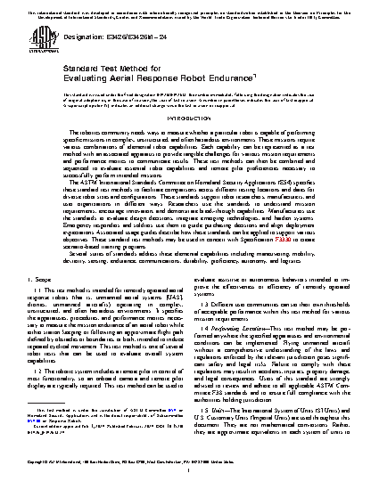 1.1 This test method is intended for remotely operated aerial response robots (that is, unmanned aerial systems [UAS], drones, unmanned aircrafts) operating in complex, unstructured, and often hazardous environments. It specifies the apparatuses, procedures, and performance metrics necessary to measure the mission endurance of an aerial robot while either station keeping or following an approximate flight path defined by obstacles or boundaries, or both, intended to induce repeated cyclical movement. This test method is one of several robot tests that can be used to evaluate overall system capabilities.