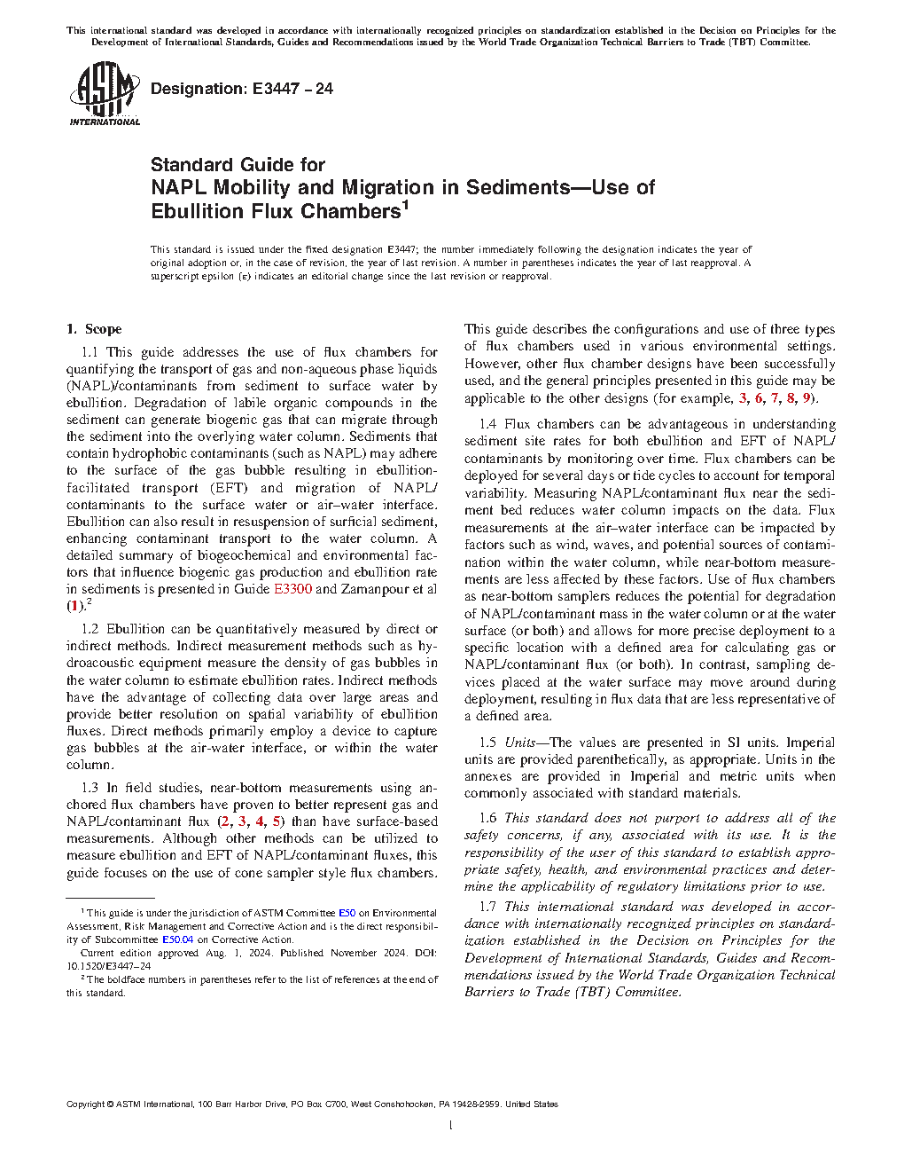 1.1 This guide addresses the use of flux chambers for quantifying the transport of gas and non-aqueous phase liquids (NAPL)/contaminants from sediment to surface water by ebullition. Degradation of labile organic compounds in the sediment can generate biogenic gas that can migrate through the sediment into the overlying water column. Sediments that contain hydrophobic contaminants (such as NAPL) may adhere to the surface of the gas bubble resulting in ebullition-facilitated transport (EFT) and migration of NAPL/contaminants to the surface water or air–water interface. Ebullition can also result in resuspension of surficial sediment, enhancing contaminant transport to the water column. A detailed summary of biogeochemical and environmental factors that influence biogenic gas production and ebullition rate in sediments is presented in Guide E3300 and Zamanpour et al (1).2