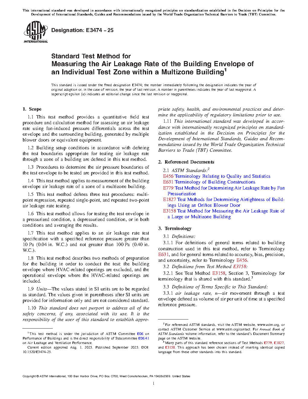 5.3 This test method is used to determine the airtightness of a portion of a building envelope by measuring the air leakage rate of the constructed envelope through a single zone of a multizone building at a specified reference pressure. Compared to a multizone building test, such as described in Test Method E3158 which accurately measures whole building airtightness, accurate measurement of the air leakage rate through an individual test zone requires closer tolerances with respect to the creation and maintenance of a balanced zone condition during air leakage rate measurements.