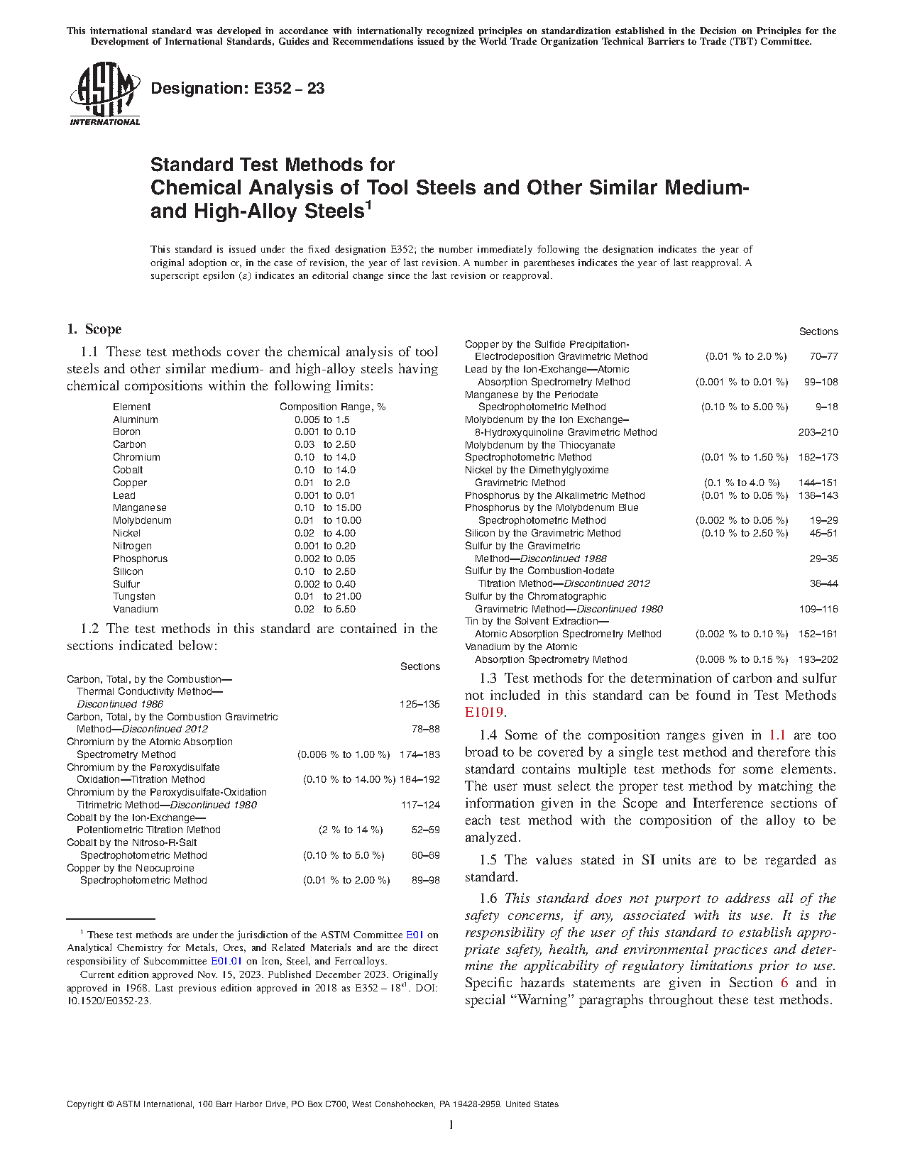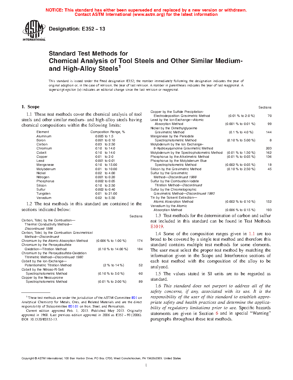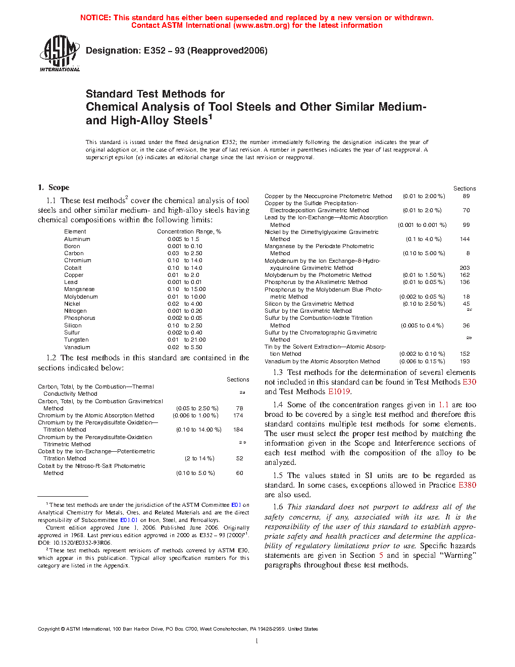 1.1 These test methods cover the chemical analysis of tool steels and other similar medium- and high-alloy steels having chemical compositions within the following limits: