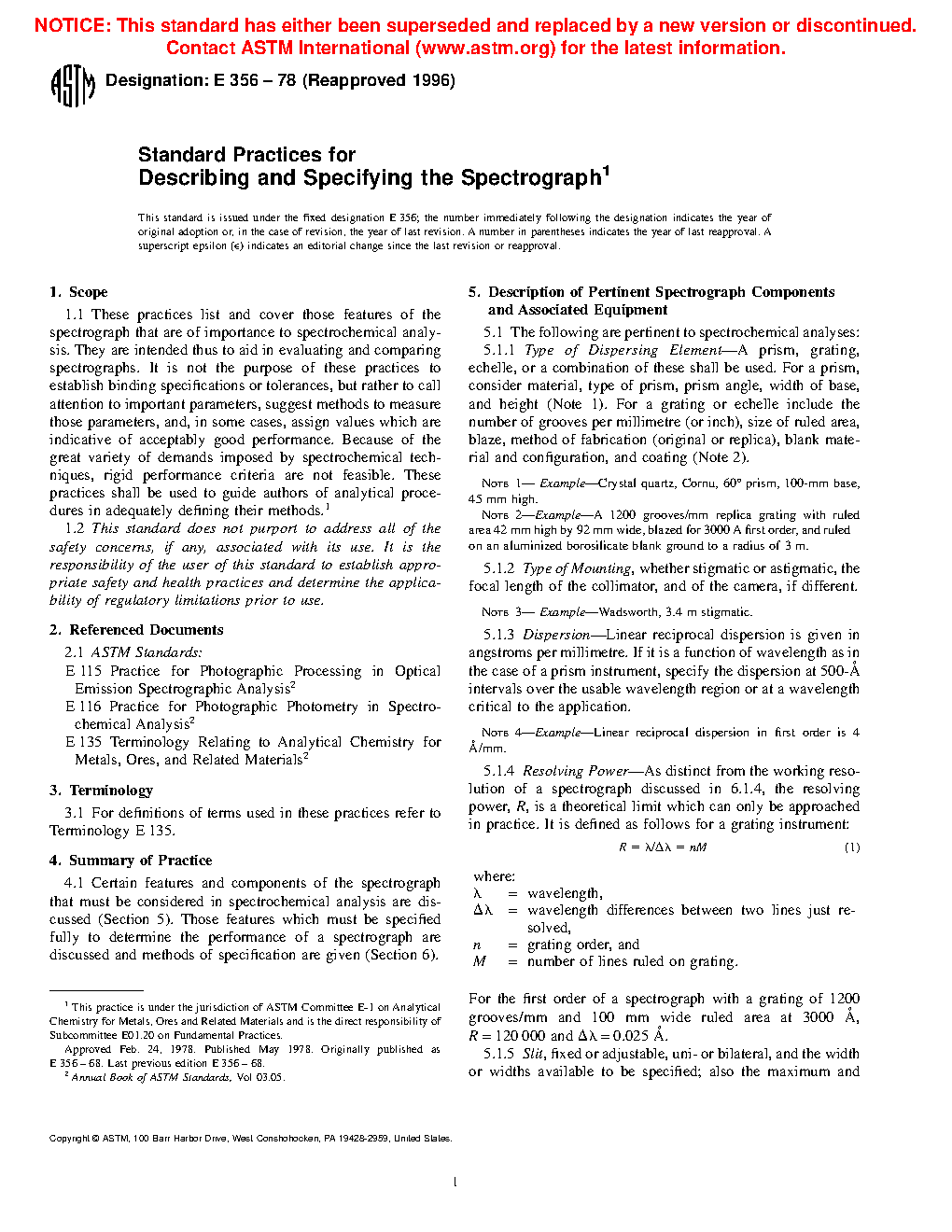 1.1 These practices list and cover those features of the spectrograph that are of importance to spectrochemical analysis. They are intended thus to aid in evaluating and comparing spectrographs. It is not the purpose of these practices to establish binding specifications or tolerances, but rather to call attention to important parameters, suggest methods to measure those parameters, and, in some cases, assign values which are indicative of acceptably good performance. Because of the great variety of demands imposed by spectrochemical techniques, rigid performance criteria are not feasible. These practices shall be used to guide authors of analytical procedures in adequately defining their methods.
