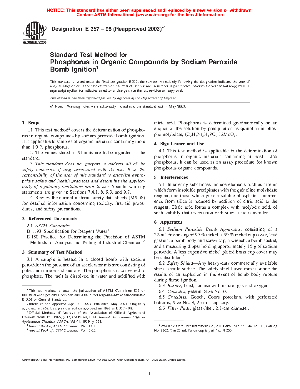 1.1 This test method covers the determination of phosphorus in organic compounds by sodium peroxide bomb ignition. It is applicable to samples of organic materials containing more than 1.0% phosphorus.