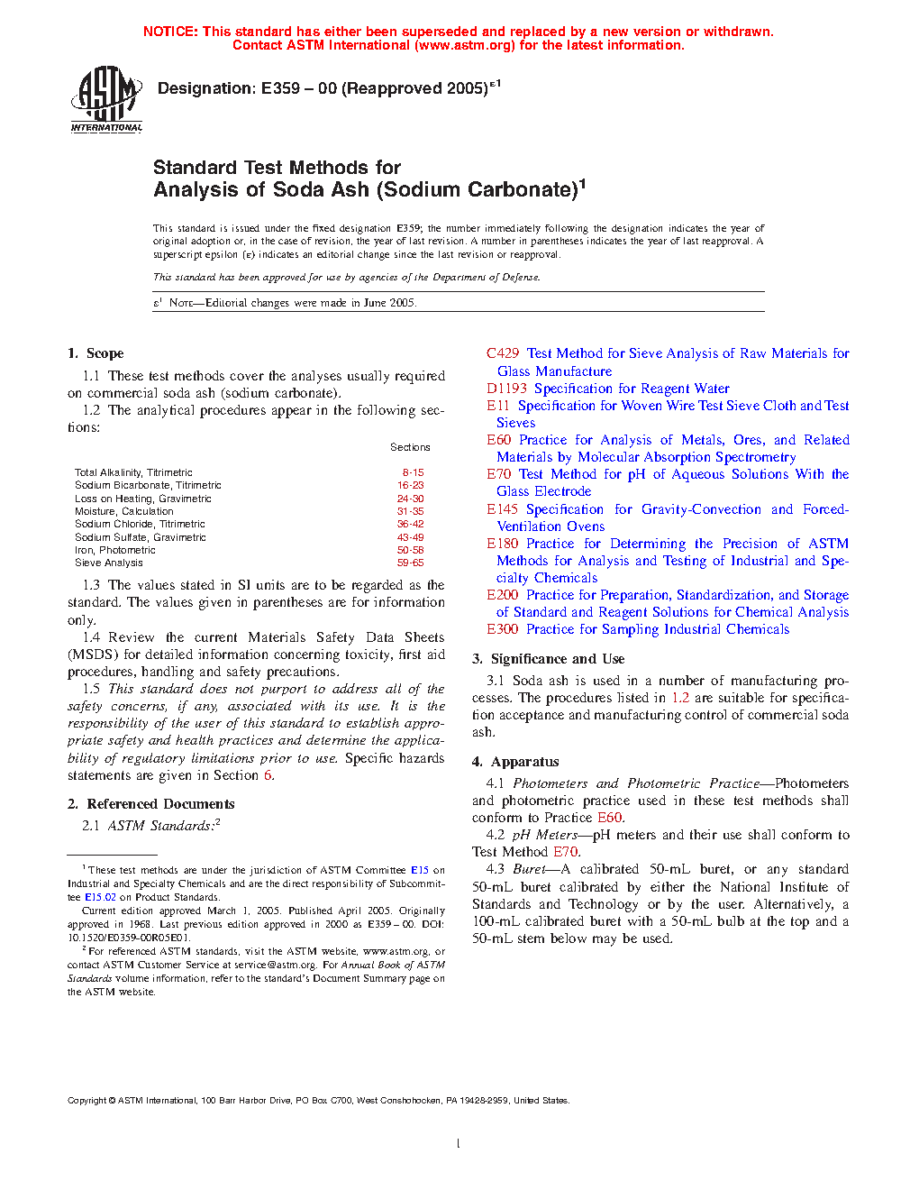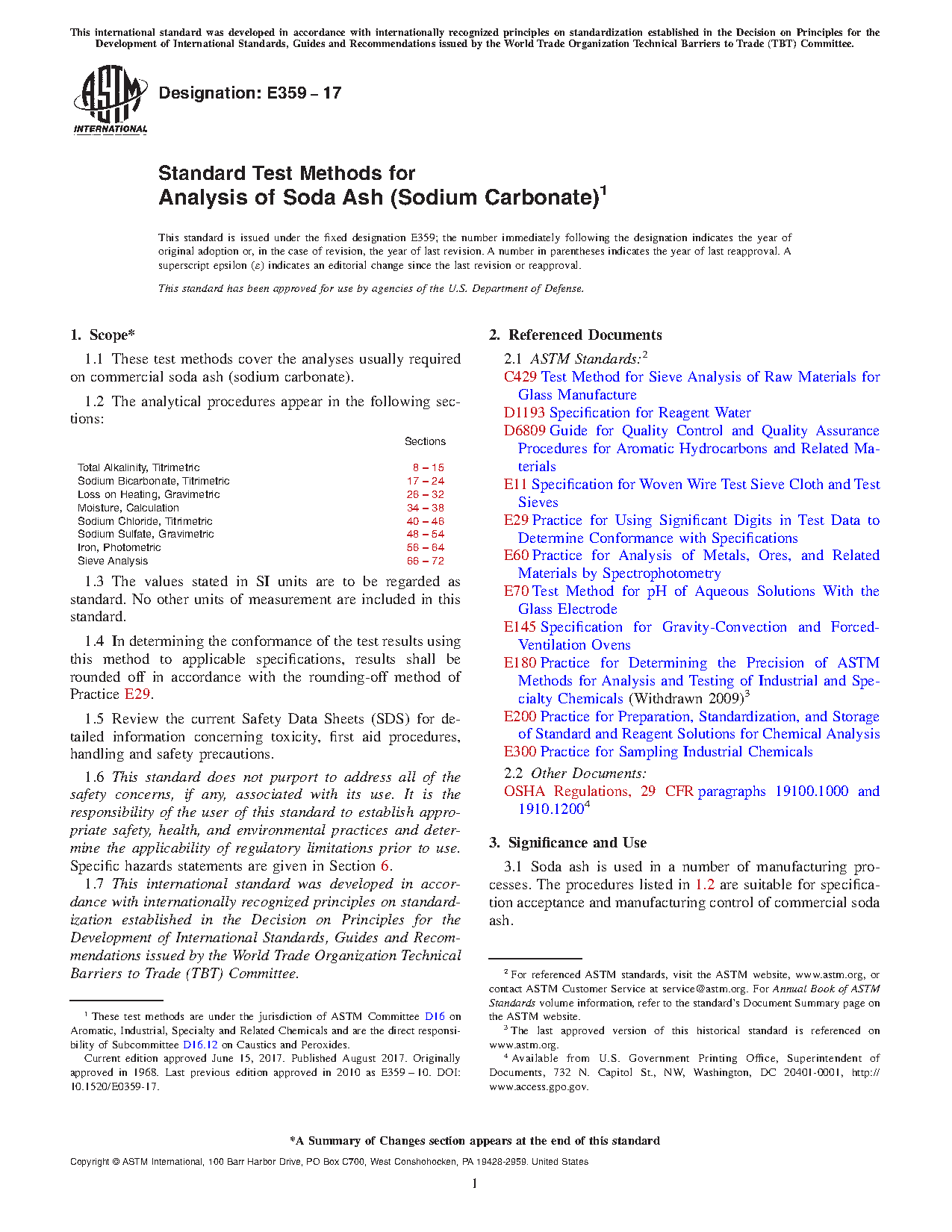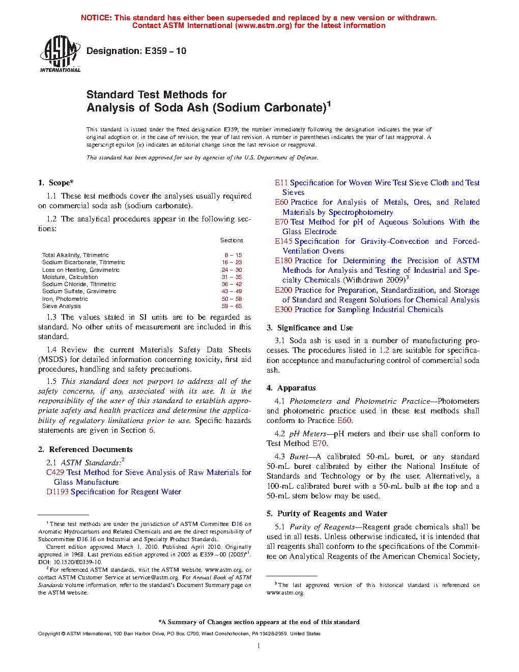 Sections Total Alkalinity, Titrimetric 8 to 15 Sodium Bicarbonate, Titrimetric 16 to 23 Loss on Heating, Gravimetric 24 to 30 Moisture, Calculation 31 to 35 Sodium Chloride, Titrimetric 36 to 42 Sodium Sulfate, Gravimetric 43 to 49 Iron, Photometric 50 to 58 Sieve Analysis 59 to 651.3 The values stated in SI units are to be regarded as the standard. The values given in parentheses are for information only.